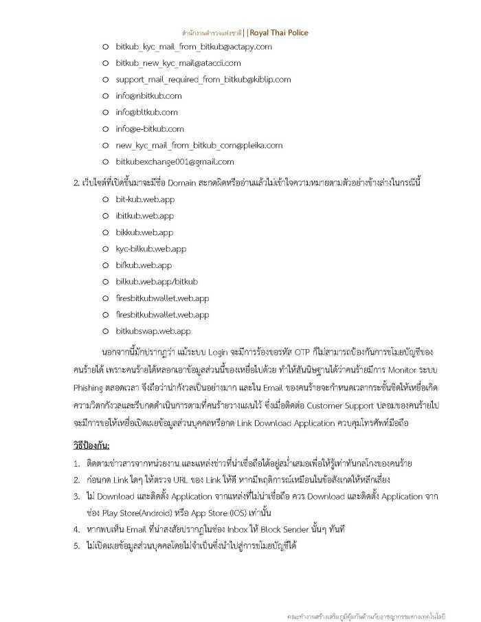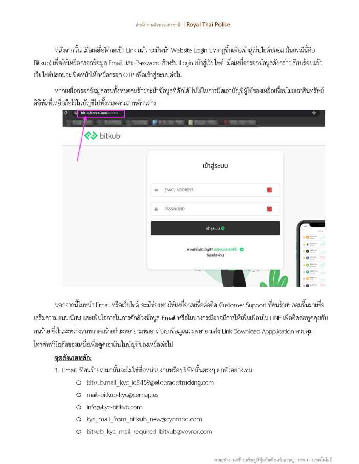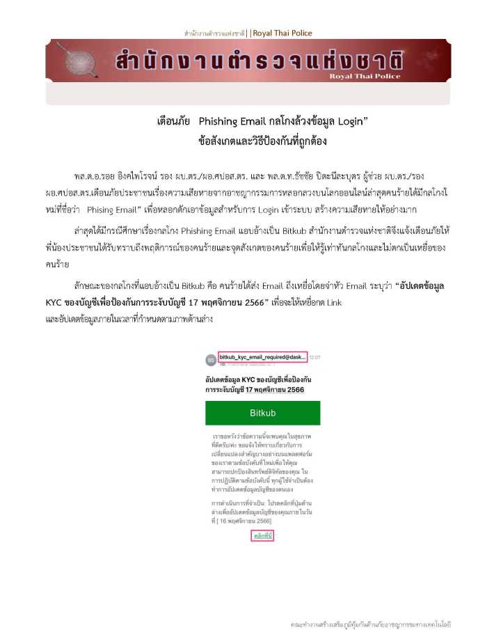 ล่าสุดได้มีกรณีศึกษาเรื่องกลโกง Phishing Email แอบอ้างเป็น Bitkub สำนักงานตำรวจแห่งชาติจึงแจ้งเตือนภัยให้พี่น้องประชาชนได้รับทราบถึงพฤติการณ์ของคนร้ายและจุดสังเกตของคนร้ายเพื่อให้รู้เท่าทันกลโกงและไม่ตกเป็นเหยื่อของคนร้าย ลักษณะของกลโกงที่แอบอ้างเป็น Bitkub คือ คนร้ายได้ส่ง Email ถึงเหยื่อโดยจ่าหัว Email ระบุว่า “อัปเดตข้อมูล KYC ของบัญชีเพื่อป้องกันการระงับบัญชี 17 พฤศจิกายน 2566” เพื่อจะให้เหยื่อกด Link และอัปเดตข้อมูลภายในเวลาที่กำหนดตามภาพด้านล่าง
