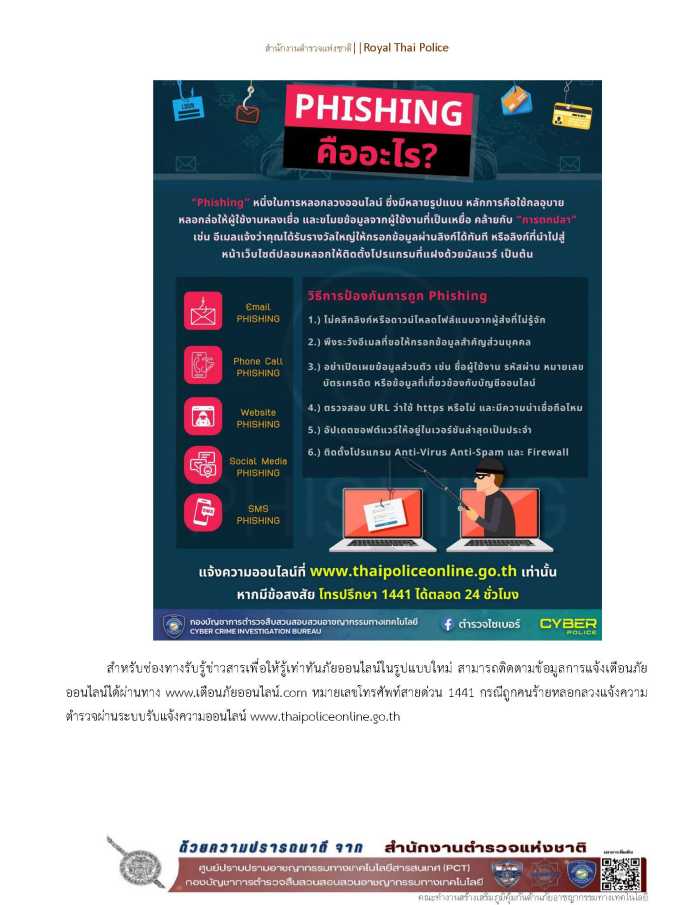 พล.ต.อ.รอย อิงคไพโรจน์ รอง ผบ.ตร./ผอ.ศปอส.ตร. และ พล.ต.ท.ธัชชัย ปิตะนีละบุตร ผู้ช่วย ผบ.ตร./รอง ผอ.ศปอส.ตร. เตือนภัยประชาชนเรื่องความเสียหายจากอาชญากรรมการหลอกลวงบนโลกออนไลน์ล่าสุดคนร้ายได้มีกลโกงใหม่ที่ชื่อว่า “Phising Email” เพื่อหลอกดักเอาข้อมูลสำหรับการ Login เข้าระบบ สร้างความเสียหายให้อย่างมาก