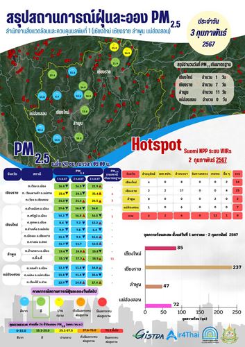 📢 สรุปสถานการณ์ฝุ่น PM2.5 ประจำวันที่ 3 กุมภาพันธ์ 2567 ในพื้นที่รับผิดชอบของสำนักงานสิ่งแวดล้อมและควบคุมมลพิษที่ 1 (เชียงใหม่ เชียงราย ลำพูน แม่ฮ่องสอน)