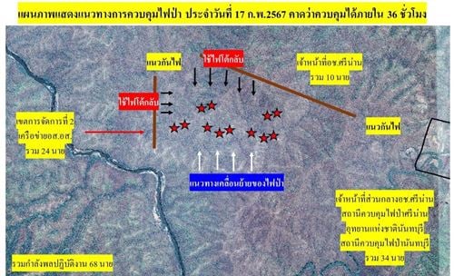 เนื่องจากมีป่าไผ่ขนานหนาแน่นตามแนวไฟ การทำแนวกันไฟไฟชนไฟ จะดำเนินการโดยทำแนวให้แคบที่สุด และใช้เวลาให้รวดเร็วที่สุด รวมกำลังเจ้าหน้าที่ในการปฏิบัติการครั้งนี้จำนวน 68 นาย จากการวางแผนและการบัญชาการของผู้อำนวยการสำนักบริหารพื้นที่อนุรักษ์ที่ 13 กำลังของเจ้าหน้าที่ทั้งหมดยังคงพักค้างคืนในพื้นที่เพื่อให้มั่นใจว่าไฟป่าได้ดับสนิทและไม่ลุกลามต่อไป คาดว่าจะดำเนินการให้แล้วเสร็จภายใน 36 ชั่วโมง