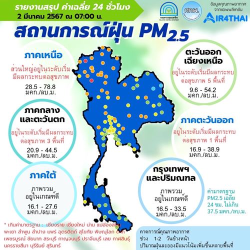 ภาพรวมปริมาณ PM2.5 ในประเทศพบเกินค่ามาตรฐานใน จ.เชียงราย จ.เชียงใหม่ จ.น่าน จ.แม่ฮ่องสอน จ.พะเยา จ.ลำพูน จ.ลำปาง จ.แพร่ จ.อุตรดิตถ์ จ.สุโขทัย จ.พิษณุโลก จ.ตาก จ.เพชรบูรณ์ จ.ชัยนาท จ.สระบุรี จ.กาญจนบุรี จ.ปราจีนบุรี จ.เลย จ.กาฬสินธุ์ จ.นครราชสีมา จ.บุรีรัมย์ และ จ. สุรินทร์