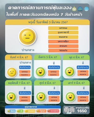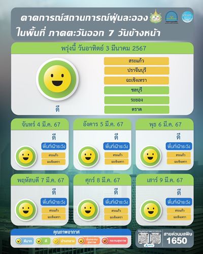 คาดการสถานการณ์ฝุ่นละออง 7 วันข้างหน้า ระหว่างวันที่ 3 – 9 มี.ค.67