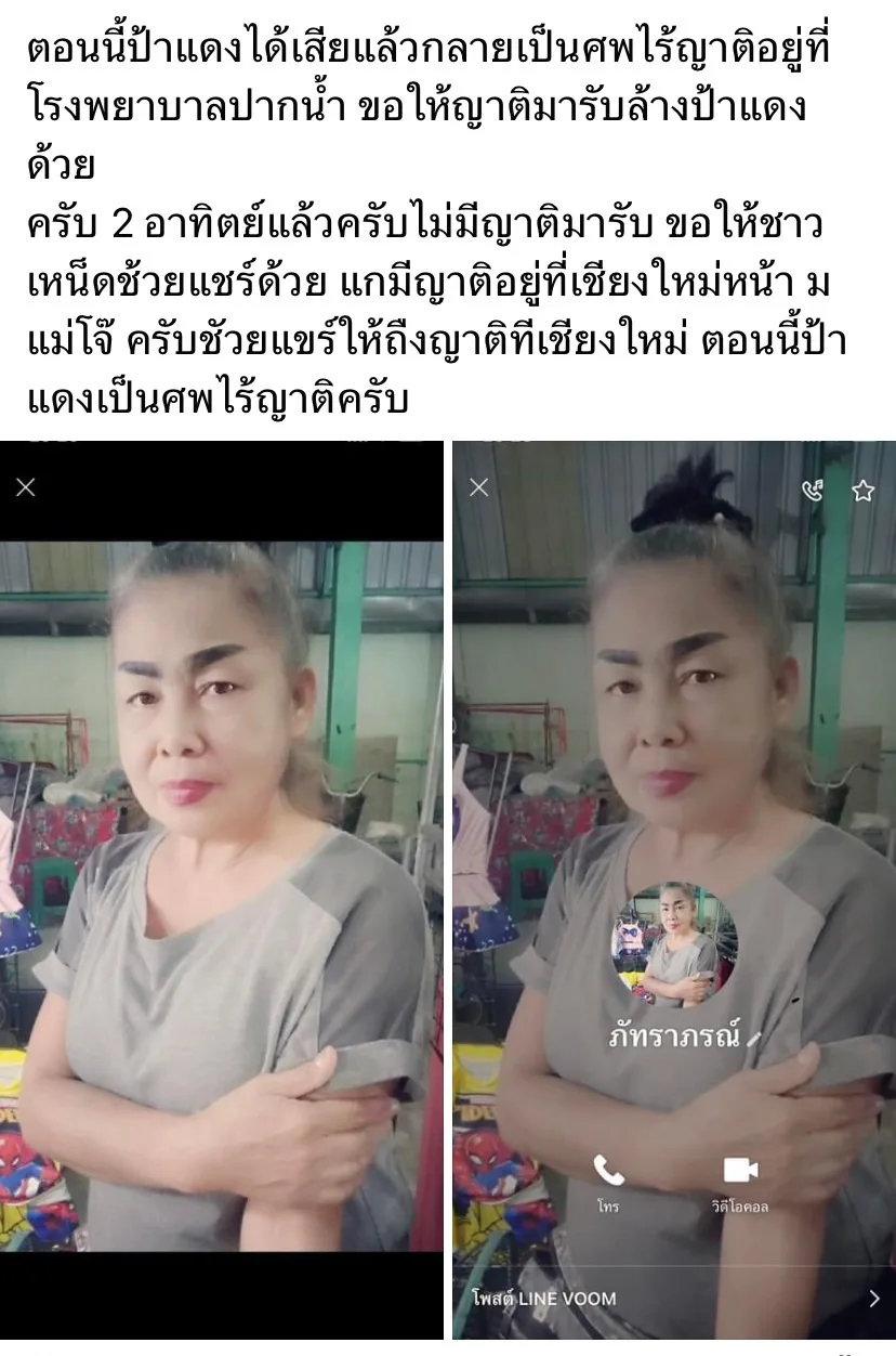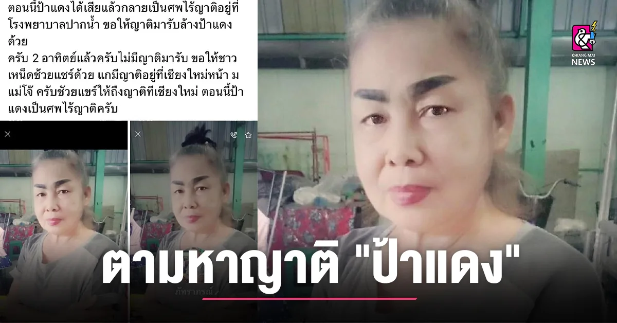 ทั้งนี้ทราบว่าแกมีญาติอยู่ที่เชียงใหม่แถวหน้า ม.แม่โจ้ ครับ ช่วยแชร์ให้ถึงญาติที่เชียงใหม่ ตอนนี้ป้าแดงเป็นศพไร้ญาติครับ