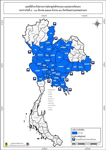 นายไชยวัฒน์ จุนถิระพงศ์ อธิบดีกรมป้องกันและบรรเทาสาธารณภัย (ปภ.) เปิดเผยว่า กองอำนวยการป้องกันและบรรเทาสาธารณภัยกลาง (กอปภ.ก.) โดยกรมป้องกันและบรรเทาสาธารณภัย ได้ติดตามสภาวะอากาศและพิจารณาปัจจัยเสี่ยง ประกอบกับกรมอุตุนิยมวิทยาได้มีประกาศฉบับที่ 3 (54/2567) ลงวันที่ 7 มีนาคม 2567 เวลา 17.00 น. แจ้งว่า บริเวณความกดอากาศสูงจากสาธารณรัฐประชาชนจีนจะแผ่ลงมาปกคลุมภาคตะวันออกเฉียงเหนือประกอบกับมีลมใต้และลมตะวันออกเฉียงใต้พัดนำความชื้นจากอ่าวไทยและทะเลจีนใต้เข้ามาปกคลุมประเทศไทยตอนบน ในขณะที่ประเทศไทยตอนบนมีอากาศร้อนถึงร้อนจัดหลายพื้นที่ ทำให้ภาคเหนือตอนล่าง ภาคตะวันออกเฉียงเหนือ ภาคกลาง รวมทั้งกรุงเทพมหานครและปริมณฑลจะมีพายุฤดูร้อน โดยมีพื้นที่เฝ้าระวัง สถานการณ์พายุฝนฟ้าคะนองและลมกระโชกแรง ระหว่างวันที่ 8-10 มีนาคม 2567 ดังนี้