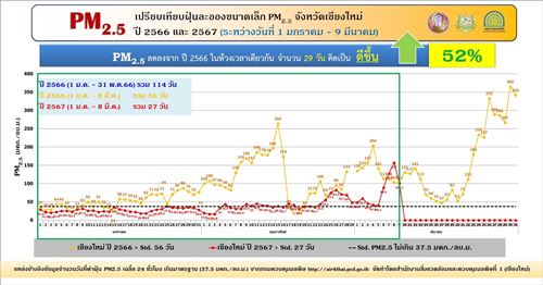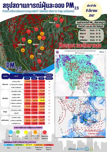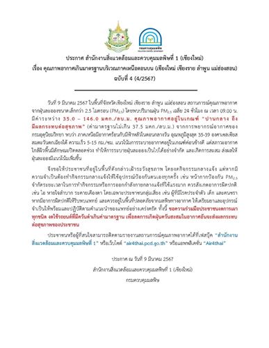 มีประกาศ สำนักงานสิ่งแวดล้อมและควบคุมมลพิษที่ 1 (เชียงใหม่) กรมควบคุมมลพิษ เรื่อง คุณภาพอากาศเกินมาตรฐานบริเวณภาคเหนือตอนบน (เชียงใหม่ เชียงราย ลำพูน แม่ฮ่องสอน) ฉบับที่ 4 (4/2567) วันที่ 9 มีนาคม 2567 ในพื้นที่จังหวัดเชียงใหม่ เชียงราย ลำพูน แม่ฮ่องสอน สถานการณ์คุณภาพอากาศ จากฝุ่นละอองขนาดเล็กกว่า 2.5 ไมครอน ( PM25) โดยพบปริมาณฝุ่น PM25 เฉลี่ย 24 ชั่วโมง ณ เวลา 09.00 น.มีค่าระหว่าง 35.0 – 146.0 มคก./ลบ.ม. คุณภาพอากาศอยู่ในเกณฑ์ “ป่านกลาง ถึง มีผลกระทบต่อสุขภาพ ” (ค่ามาตรฐานไม่เกิน 37.5 มคก./ลบ.ม.) จากการพยากรณ์อากาศของกรมอุตุนิยมวิทยา พบว่า ภาคเหนือมีอากาศร้อนกับมีฟ้าหลัวในตอนกลางวัน อุณหภูมิสูงสุด 35-39 องศาเซลเซียสลมตะวันตกเฉียงใต้ ความเร็ว 5-15 กม/ชม. แนวโน้มการระบายอากาศอยู่ในเกณฑ์ค่อนข้างดี แต่สภาวะอากาศใกล้ผิวพื้นมีลักษณะปิดตลอดช่วง ทำให้การระบายฝุ่นละอองเป็นไปได้อย่างจำกัด และเกิดการสะสม ส่งผลให้ฝุ่นละอองมีแนวโน้มเพิ่มขึ้น