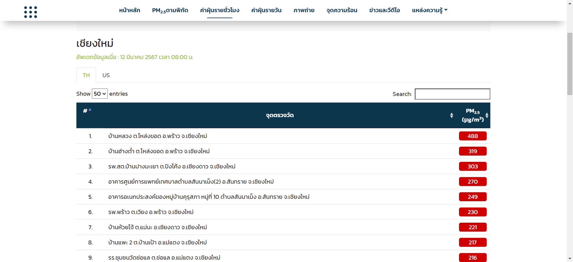 จากเว็บไซด์ cmuccdc.org ของมหาวิทยาลัยเชียงใหม่ ได้ติดตั้งเครื่องตรวจวัดค่าฝุ่นละอองขนาดเล็ก PM2.5 ตามจุดของตำบลต่างๆ ทั้ง 25 อำเภอ ของจังหวัดเชียงใหม่ อัพเดทข้อมูลเมื่อ วันที่ 12 มีนาคม 2567 เวลา 08:00 น. จำนวน 93 จุด พบมีค่าฝุนละอองขนาดเล็กเกินจากค่ามาตรฐาน PM2.5 จำนวน 72 จุด ส่วน 5 อันดับที่มีค่าฝุ่นละอองขนาดเล็ก PM2.5 มากที่สุด 1.บ้านหลวง ตำบลโหล่งขอด อำเภอพร้าว มีค่า 488 มคก./ลบ.ม. ,2.บ้านฮ่างต่ำ ตำบลโหล่งขอด อำเภอพร้าว มีค่า 319 มคก./ลบ.ม. เมตร3.รพ.สต.บ้านปางมะเยา ตำบลปิงโค้ง อำเภอเชียงดาว มีค่า 303 มคก./ลบ.ม. ,4.อาคารศูนย์การแพทย์เทศบาลตำบลสันนาเม็ง(2) อำเภอสันทราย มีค่า 270 มคก./ลบ.ม. และ5.อาคารอเนกประสงค์ของหมู่บ้านคุรุสภา หมู่ที่ 10 ตำบลสันนาเม็ง อำเภอสันทราย มีค่า 249 มคก./ลบ.ม.