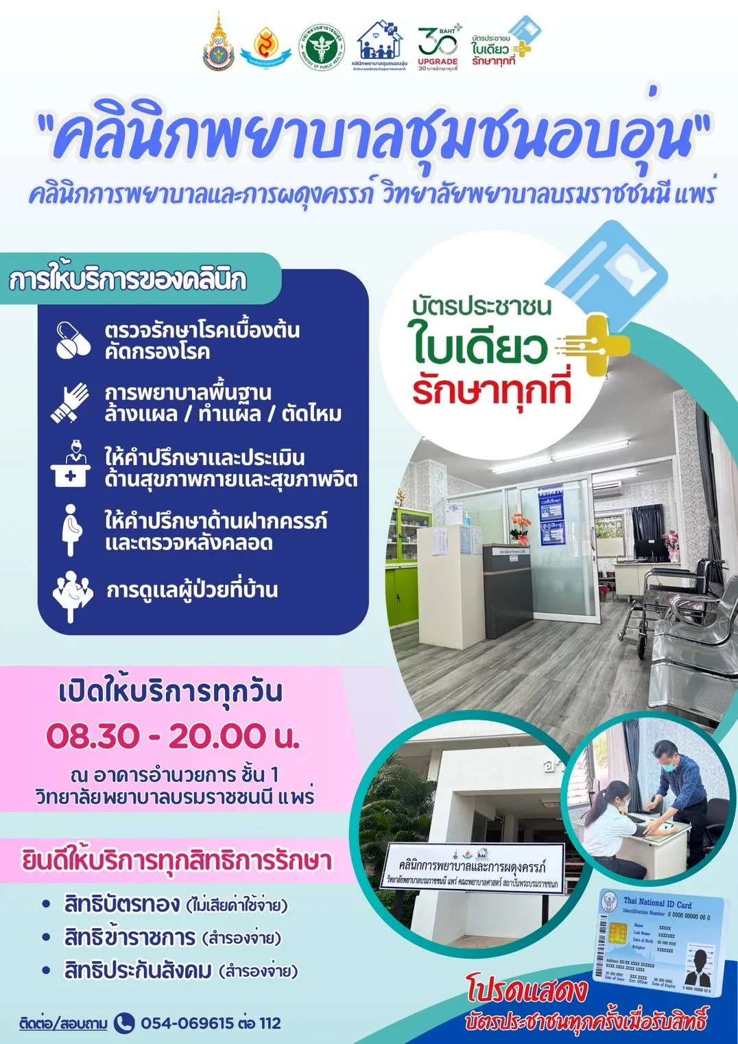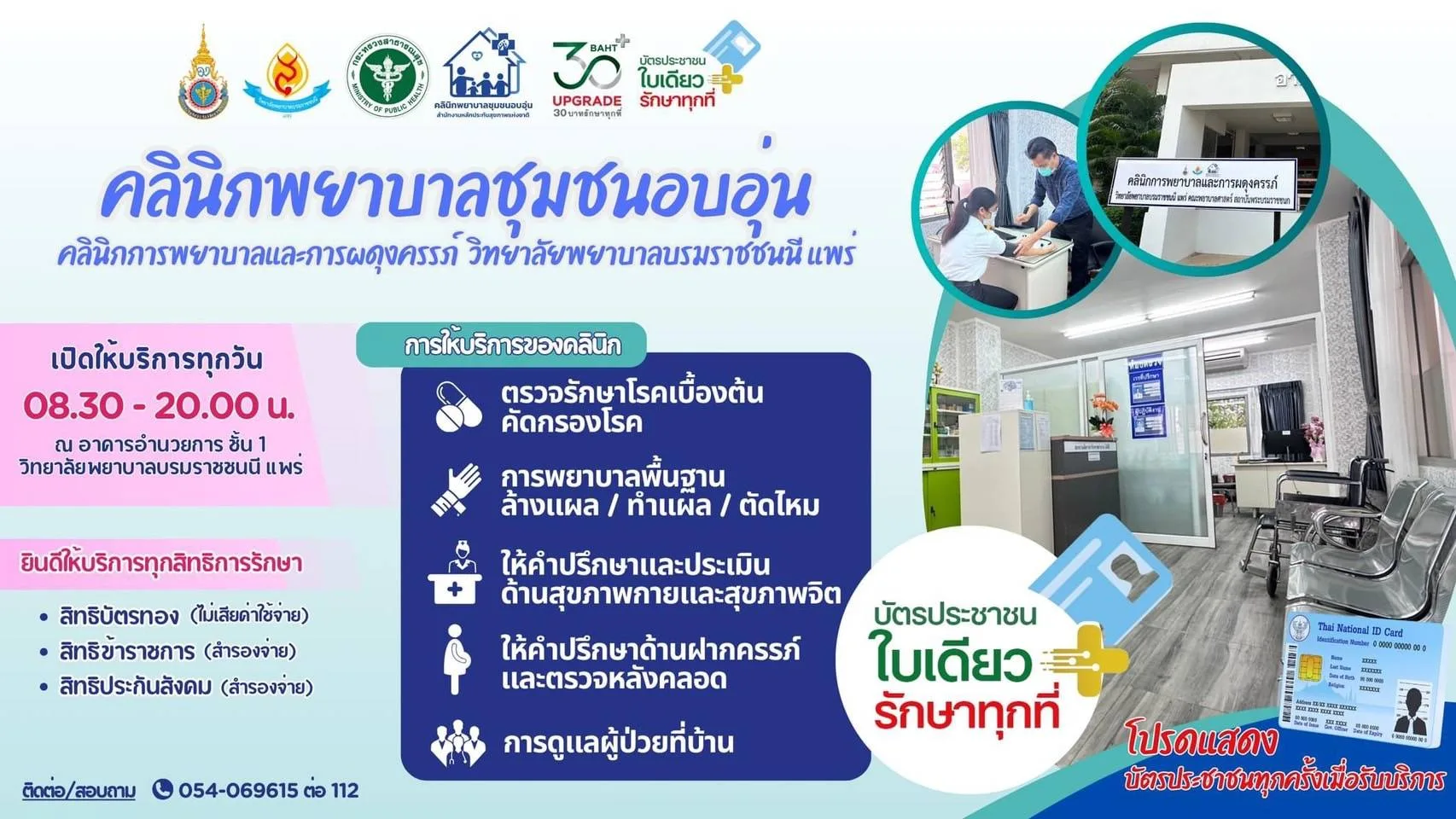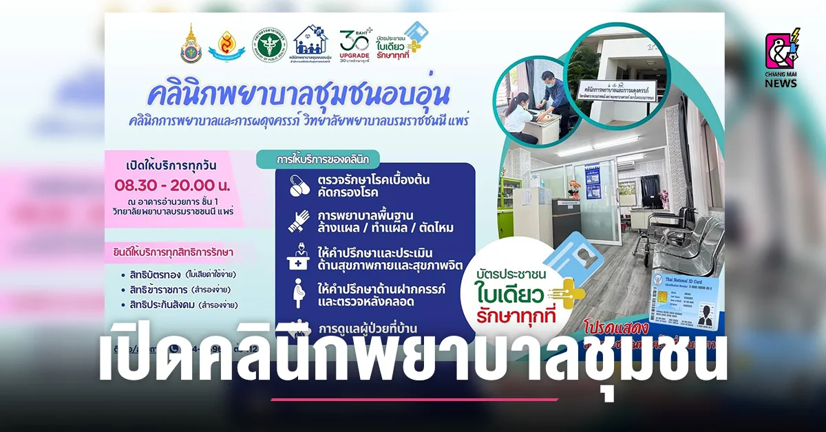 ดร.ปิ่นนเรศ กาศอุดม ผอ.วิทยาลัยพยาบาลบรมราชชนนีแพร่ เปิดเผยว่า ขณะนี้วิทยาลัยพยาบาลบรมราชชนนี แพร่ เปิดคลินิกพยาบาลชุมชนอบอุ่น โดย ให้บริการ รักษาพยาบาล ทำแผล ให้คำปรึกษา และดูแลต่อเนื่อง ตามขอบเขตวิชาชีพที่สภาการพยาบาลกำหนด และ สปสข ประกาศเข้าร่วมโครงการบัตรประชาชนใบเดียวรักษาทุกที่ “เจ็บป่วย ไม่สบาย ปวดหัว ตัวร้อน” ให้บริการรวดเร็ว สะดวก ไม่ต้องรอคิวนาน