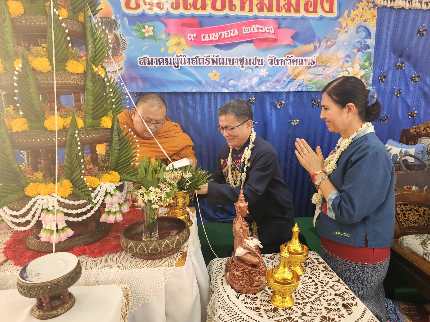 วันที่ 9 เม.ย. 67 เวลา 11.00 น. ที่ ศูนย์พัฒนาสตรี จ.แพร่ นางอัมราพร มุ้งทอง นายกสมาคมผู้นำสตรีพัฒนาชุมชนจ.แพร่และคณะสตรี จ.แพร่ จัดพิธีบายศรีสู่ขวัญ สืบสานป๋าเวณีปี๋ใหม่เมือง นายชุติเดช มีจันทร์ ผู้ว่าราชการ จ.แพร่ และนางณัชชา มีจันทร์ นายกเหล่ากาชาด จ.แพร่ เนื่องในประเพณีสงกรานต์ หรือปี๋ใหม่เมือง โดยได้รับความเมตตาจากพระครูภาวนาเจติยานุกิจ วิ.ดร. ผช.เจ้าอาวาสวัดพระธาตุช่อแฮ พระอารามหลวง รักษาการเจ้าอาวาสวัดถิ่นนอก อ.เมือง เป็นเจ้าพิธี
