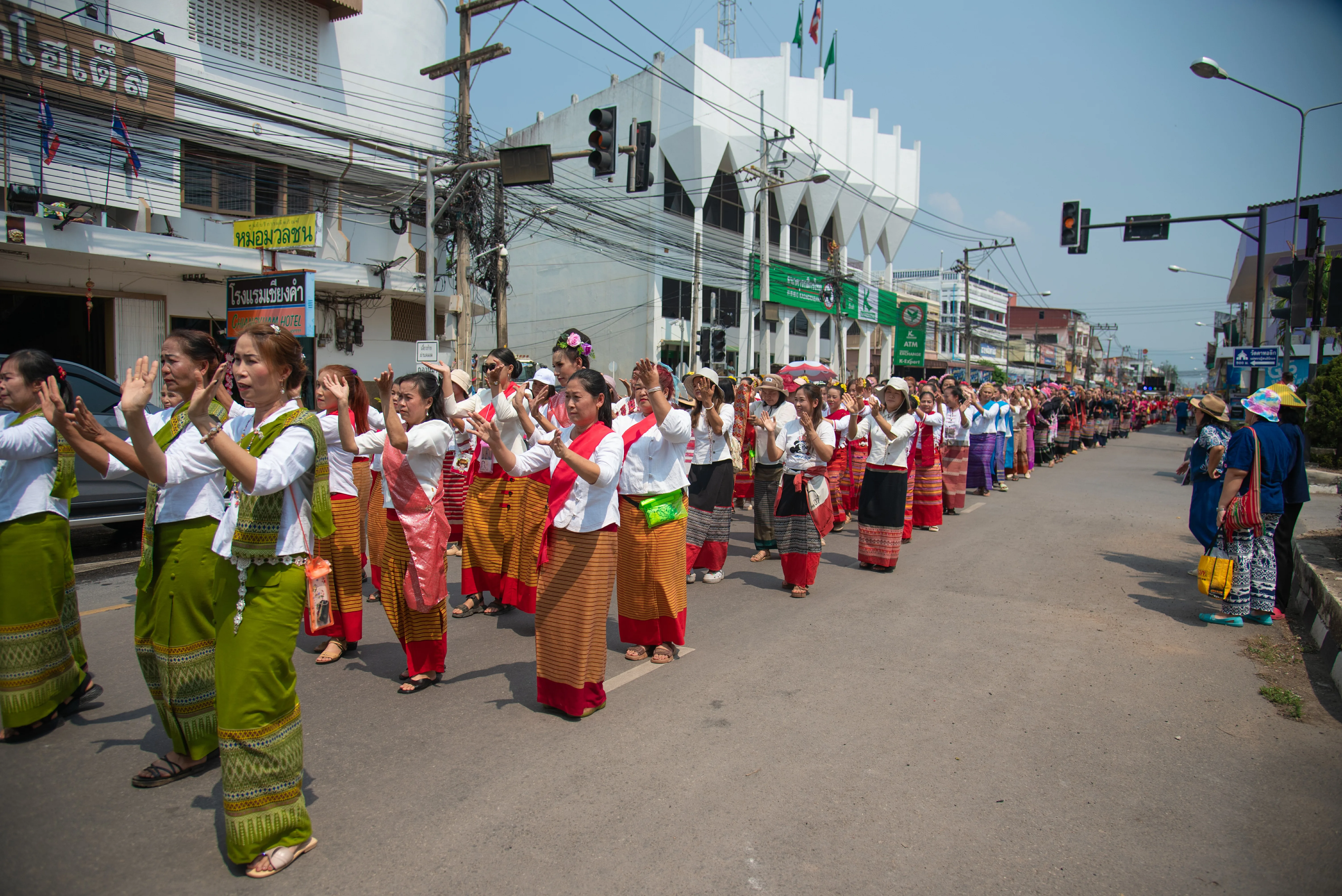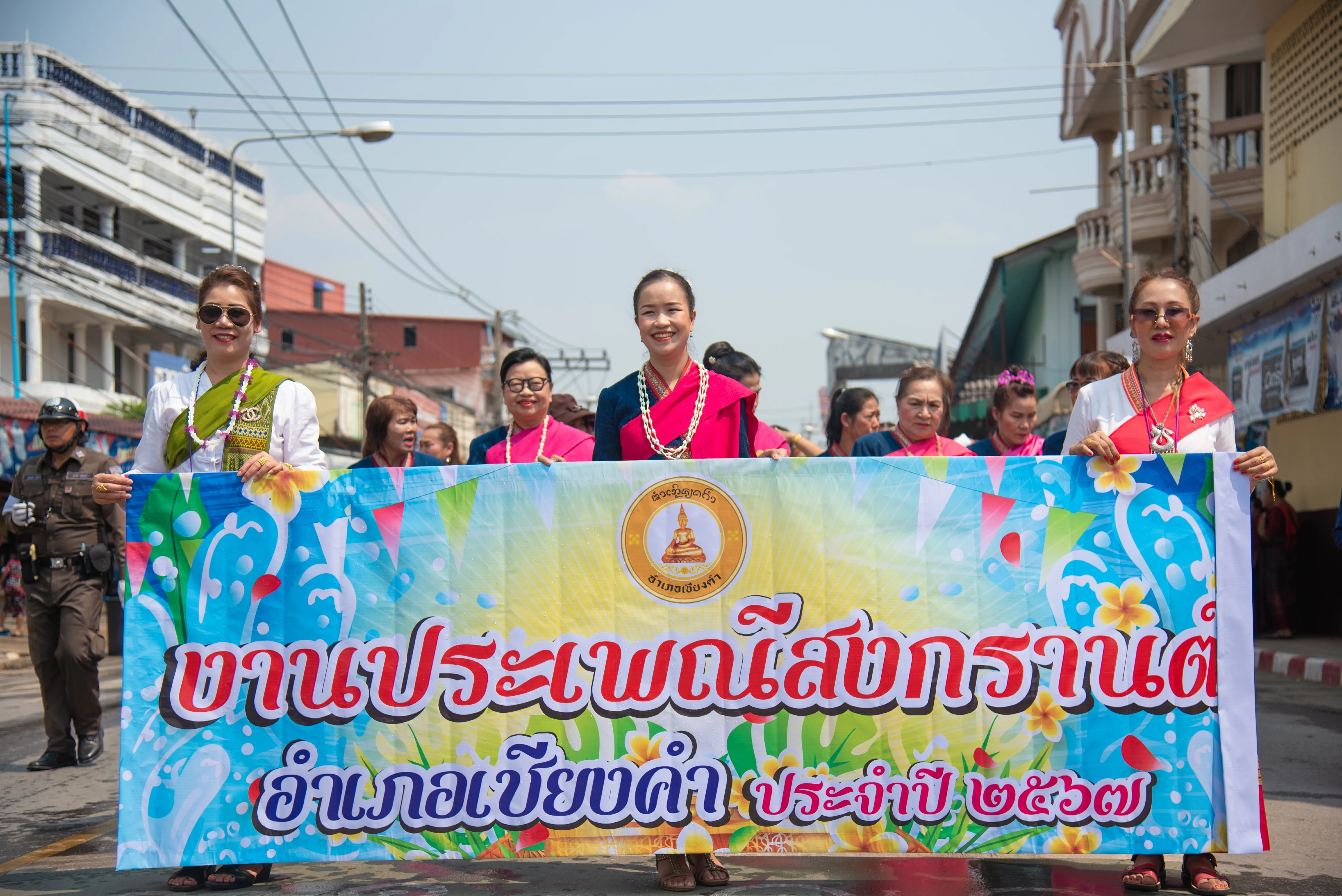 เมื่อวันที่ 17 เม.ย.67 ผู้สื่อข่าวรายงานว่า เมื่อช่วงเย็นที่ผ่านมาทางอำเภอเชียงคำ จ.พะเยา ได้มีการจัดประเพณีสงกรานต์ประจำปี 67 ขึ้น โดยได้มีการเดินขบวนแห่สงกรานต์อย่างยิ่งใหญ่ในปีนี้ ทั้งนี้พบว่าช่วงที่เดินขบวนนั้นมีกลุ่มสตรีภายในอำเภอทั้งหมด 1,370 ชีวิต จาก 137 หมู่บ้านทั่วอำเภอมาร่วมขบวนครั้งนี้กันอย่างยิ่งใหญ่อลังการ นอกจากนี้ยังมีขบวนแห่นักษัตร 12 ราศีรวมทั้งพระที่ศักดิ์ของทั้ง 10 ตำบลด้วยอีกทั้งขบวนดังกล่าวยังให้ประชาชนที่มาเที่ยวงานครั้งนี้ได้สรงน้ำพระเพื่อเป็นสิริมงคลของเทศกาลสงกรานต์ปีนี้ด้วย ทั้งนี้ในการเดินขบวนนายธวัช จรัสวรภัทร นายอำเภอเชียงคำ พร้อมด้วยภริยา ได้ร่วมเดินขบวนครั้งนี้กับทุกคนที่มารร่วมงานนี้ด้วยเช่นกัน