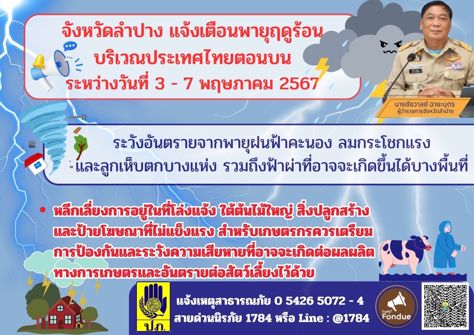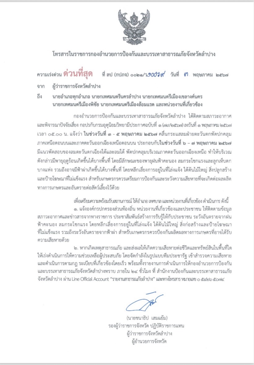 วันที่ 3 พฤษภาคม 2567 นายชัชวาลย์ ฉายะบุตร ผู้ว่าราชการจังหวัดลำปาง ออกหนังสือด่วนที่สุด ถึงนายอำเภอ และองค์กรปกครองส่วนท้องในจังหวัดลำปาง เพื่อเตรียมความพร้อมรับสถานการณ์แจ้งทุกหน่วยงาน ให้ติดตามข้อมูลสภาวะอากาศและข่าวสารจากทางราชการ ประชาสัมพันธ์สร้างการรับรู้ให้กับประชาชน ระวังอันตรายจากฝนฟ้าคะนอง ลมกระโชกแรง โดยหลีกเสี่ยงการอยู่ในที่โล่งแจ้ง ใต้ต้นไม้ใหญ่ สิ่งก่อสร้างและป้ายโฆษณาที่ไม่แข็งแรง รวมถึงระวังอันตรายจากฟ้าผ่า