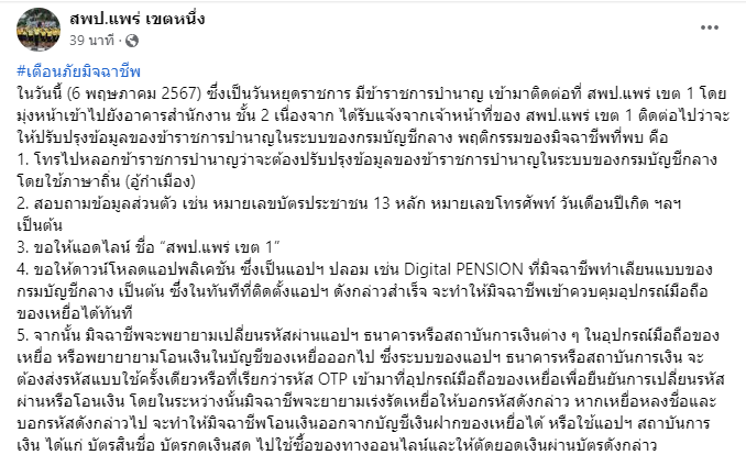 ในวันนี้ (6 พฤษภาคม 2567) ซึ่งเป็นวันหยุดราชการ มีข้าราชการบำนาญ เข้ามาติดต่อที่ สพป.แพร่ เขต 1 โดยมุ่งหน้าเข้าไปยังอาคารสำนักงาน ชั้น 2 เนื่องจาก ได้รับแจ้งจากเจ้าหน้าที่ของ สพป.แพร่ เขต 1 ติดต่อไปว่าจะให้ปรับปรุงข้อมูลของข้าราชการบำนาญในระบบของกรมบัญชีกลาง พฤติกรรมของมิจฉาชีพที่พบ คือ