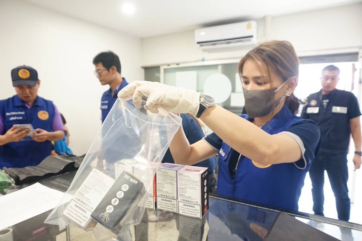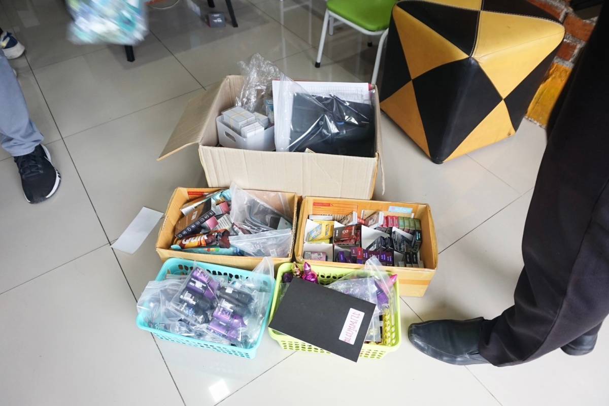 แล้วจากการตรวจสอบภายในร้านพบบุหรี่ไฟฟ้า อุปกรณ์ น้ำยา และอุปกรณ์อื่นๆ อีกมากมายซึ่งสินค้าที่ตรวจยึดได้ของกลางกว่า 1,000 ชิ้น มูลค่าหลักแสนบาท และจากการตรวจสอบการรับจ่ายเงินหรือเงินหมุนเวียนภายในร้าน พบแต่ละร้านมีรายได้ต่อวันตั้งแต่วันลหลายหมื่น บาทต่อวัน ซึ่งจากการสอบถามผู้ดูแลพบ เจ้าของที่แท้จริงจะติดต่อผ่านไลน์และส่งของมาให้ขายจึงไม่ทราบราคาต้นทุนต่อชิ้น และจะขายบุหรี่ไฟฟ้าและอุปกรณ์ตั้งแต่ราคาหลักสิบ ถึง หลักพันบาท และระหว่างที่เจ้าหน้าที่เข้าทำการตรวจสอบจะมีลูกค้ามาใช้บริการตลอดเวลา เจ้าหน้าที่จึงนำตัวผู้ดูแลทั้ง 7 ราย โดยแจ้งข้อหา
