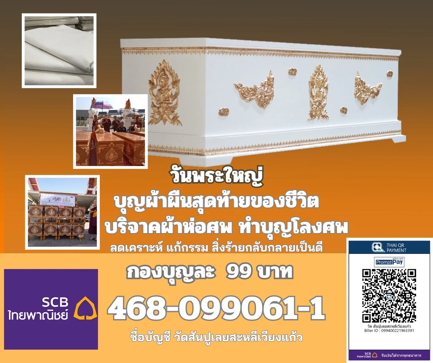 กับวัดวัดสันปูเลยสะลหีเวียงแก้ว อำเภอดอยสะเก็ด จังหวัดเชียงใหม่ เจ้าภาพโลงละ 1,500 บาท ผ้าห่อศพ 150 บาท
