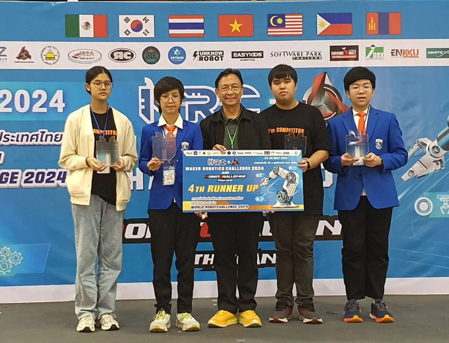 โดยมีผู้ฝึกสอนและควบคุมทีม ประกอบด้วยนายธนสิน ชูเกียรติตกุล นางสาวรุ่งทิพย์ จันดีและนางสาวณัฐวดี ทาหลี จากกลุ่มสาระการเรียนรู้วิทยาศาสตร์และเทคโนโลยี ซึ่งนักเรียนจะได้รับสิทธิ์เป็นตัวแทนประเทศไทยเข้าร่วมการแข่งขันหุ่นยนต์ในระดับนานาชาติ ่ณ ประเทศเกาหลีและกรุงปักกิ่ง