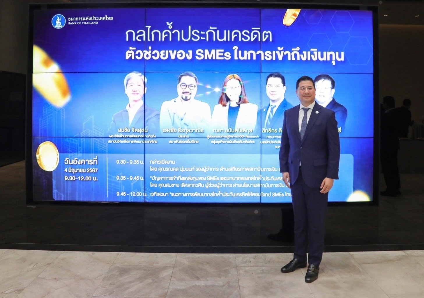นายสิทธิกร ดิเรกสุนทร กรรมการและผู้จัดการทั่วไป บรรษัทประกันสินเชื่ออุตสาหกรรมขนาดย่อม (บสย.) กล่าวในงานเสวนา “กลไกค้ำประกันเครดิต ตัวช่วยของ SMEs ในการเข้าถึงเงินทุน” จัดโดยธนาคารแห่งประเทศไทย โดยมี นายสมชัย จิตสุชน ผู้อำนวยการวิจัยด้านการพัฒนาอย่างทั่วถึง สถาบันวิจัยเพื่อการพัฒนาประเทศไทย (TDRI), นายแสงชัย ธีรกุลวาณิช ประธานสมาพันธ์เอสเอ็มอีไทย, นายชัยยศ ตันพิสุทธิ์ ผู้ช่วยผู้จัดการใหญ่ ธนาคารกสิกรไทย ดำเนินรายการโดย ดร.ณชา อนันต์โชติกุล ผู้ช่วยกรรมการผู้จัดการ KKP Research กลุ่มธุรกิจการเงินเกียรตินาคินภัทร ณ ธนาคารแห่งประเทศไทย เมื่อวันที่ 4 มิถุนายน 2567