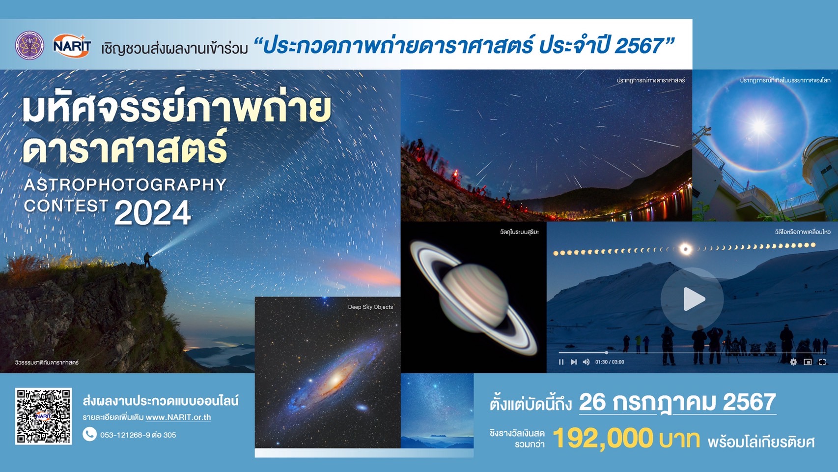 สถาบันวิจัยดาราศาสตร์แห่งชาติ (องค์การมหาชน) (สดร.) (NARIT) กระทรวงการอุดมศึกษา วิทยาศาสตร์ วิจัย และนวัตกรรม (อว.) ชวนส่งภาพถ่ายและวิดีโอร่วมประกวดในหัวข้อ “มหัศจรรย์ภาพถ่ายดาราศาสตร์” ประจำปี 2567 ชิงโล่เกียรติยศ พร้อมเงินรางวัล มูลค่ารวมกว่า 192,000 บาท สมัครและส่งผลงานได้ตั้งแต่บัดนี้ – 26 กรกฎาคม 2567