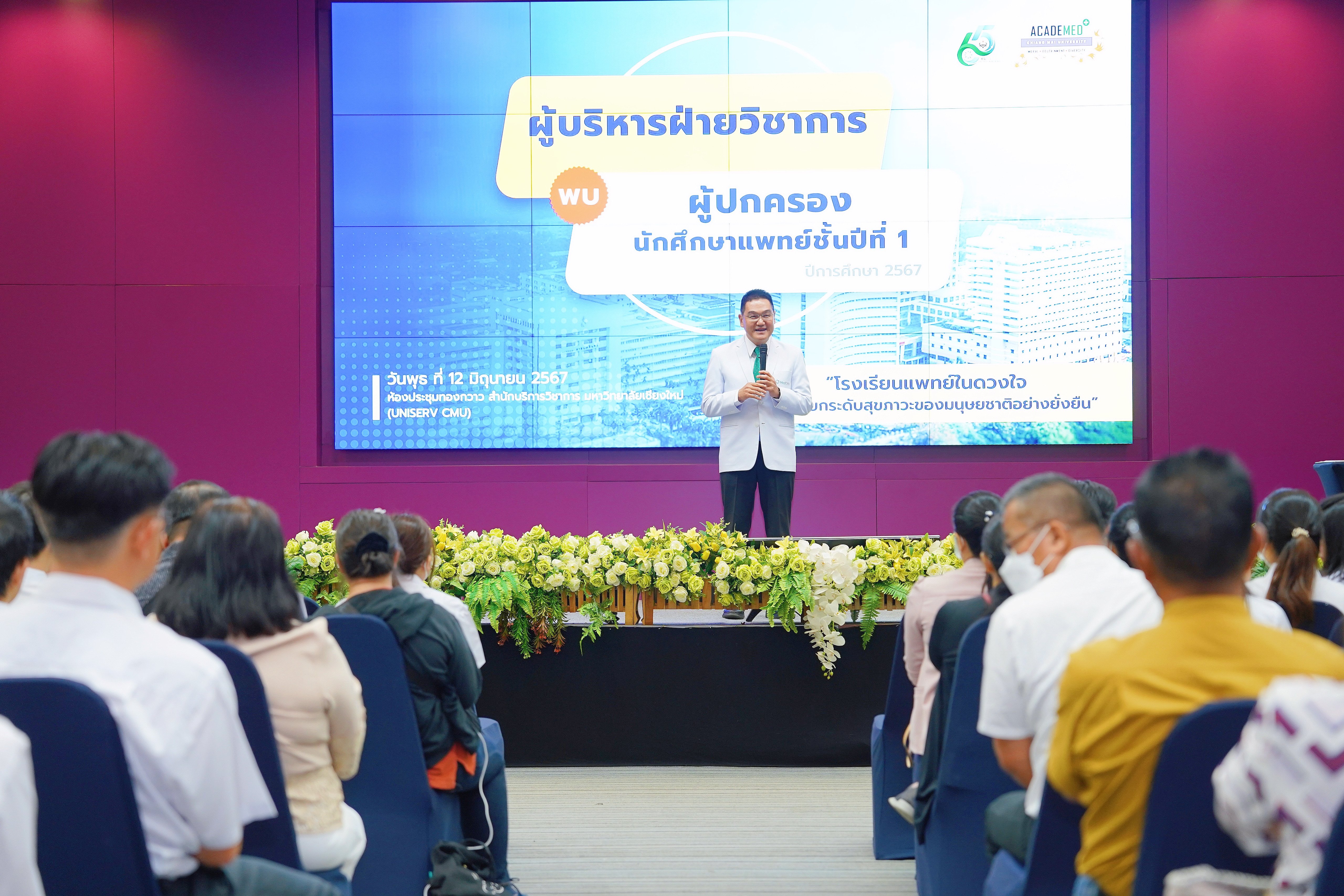 ซึ่งการเรียนชั้นปีที่ 1 นับเป็นก้าวแรกของการใช้ชีวิตในรั้วมหาวิทยาลัย เพื่อให้นักศึกษาได้รู้บทบาทของตนเอง ได้รับการส่งเสริมและพัฒนาตามวัตถุประสงค์ของการศึกษา หลักสูตรสาขาวิชาแพทยศาสตร์ และคุณสมบัติของแพทย์เชียงใหม่ ได้ทราบแนวทางการเรียนการสอน ตลอดจนการปรับตัว การดูแลซึ่งกันและกันในช่วงระหว่างการเรียนแพทย์ เพื่อเตรียมตัวเป็นแพทย์ที่ดีในวันข้างหน้า โดยมี ศ.ดร.นพ.พงษ์รักษ์ ศรีบัณฑิตมงคล อธิการบดีมหาวิทยาลัยเชียงใหม่ กล่าวต้อนรับ รศ.พญ.ประภาพร สู่ประเสริฐ รองคณบดีคณะแพทยศาสตร์ แนะนำทีมวิชาการ AcadeMED+ ในวันที่ 12 มิถุนายน 2567 ณ ห้องประชุมทองกวาว สำนักบริการวิชาการ มหาวิทยาลัยเชียงใหม่