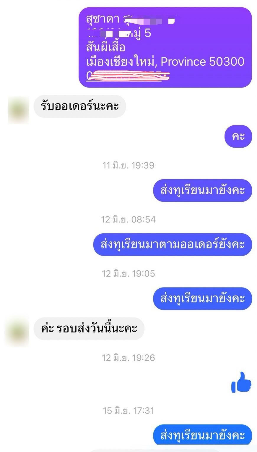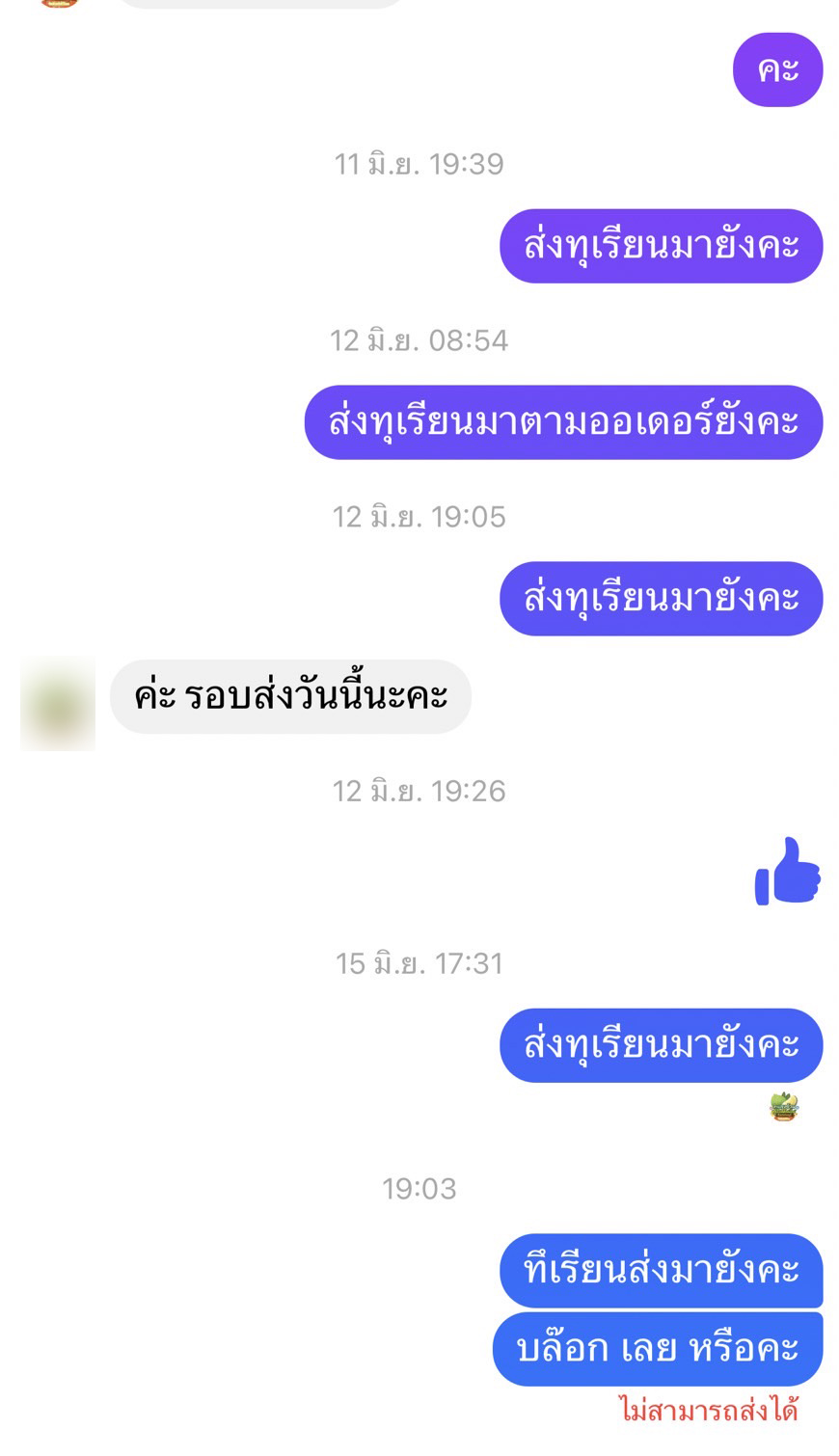 เมื่อผ่านมาหลายวันก็ไม่ได้รับทุเรียน เมื่อทวงถามไปช่วงแรก ๆ ก็ตอบว่าได้จัดส่งไปแล้วแต่ก็ยังไม่ได้รับของ เมื่อทวงถามไปอีกเธอก็ถูกบล็อกเฟสติดต่อไม่ได้จนถึงเดี๋ยวนี้ จึงตัดสินใจนำเรื่ิองราวที่เกิดขึ้นนำมาเปิดเผย และฝากเตือนภัยสั่งซื้อสิ้นค้าทางออนไลน์และอาจตกเป็นเหยื่อได้