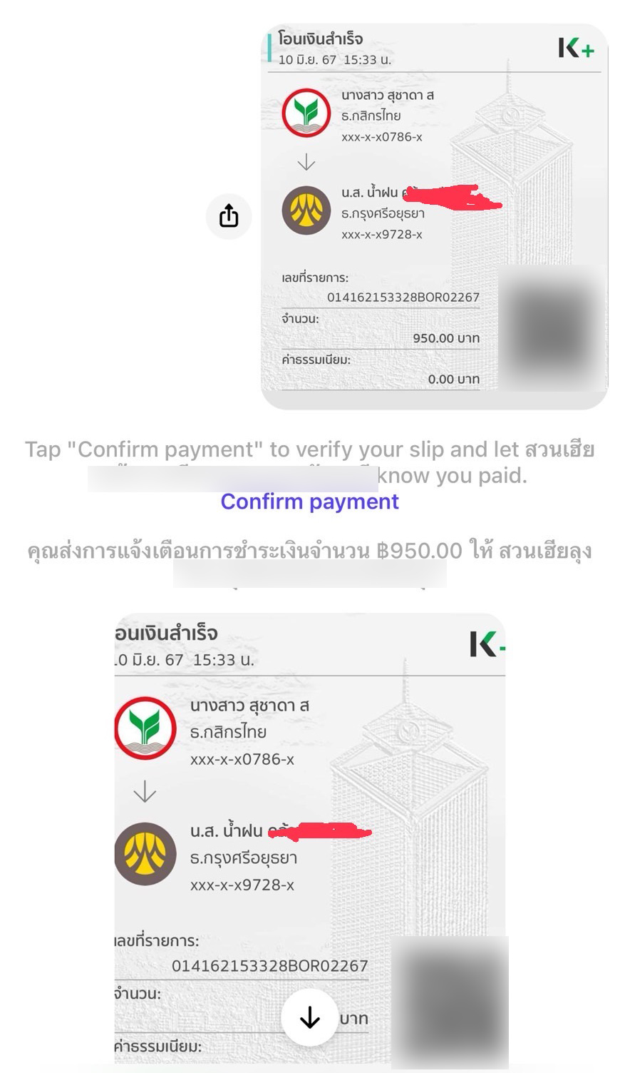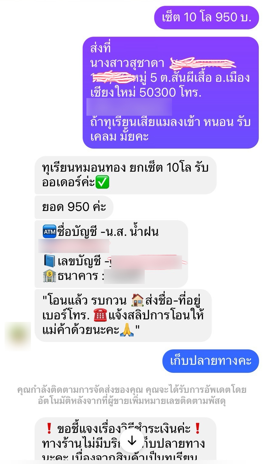 ซึ่งเธอมีความเชื่อถือว่าเป็นเพจจริง จึงสนใจสั่งซื้อทุเรียนหมอนทอง 10 โล ยกเซ็ต 950 บาท และได้เซทติดต่อไปจ่ายเงินปลายทางเมื่อรับของแล้ว แต่ทางนั้นตอบว่า ต้องการจ่ายสดให้โอนเงินมาให้ก่อน เนื่องจากเป็นผลไม้ ทางเธอหลงเชื่อจึงโอนเงิน 950 บาท ไปยังชื่อบัญชี น.ส.น้ำฝน ธนาคารกรุงศรี