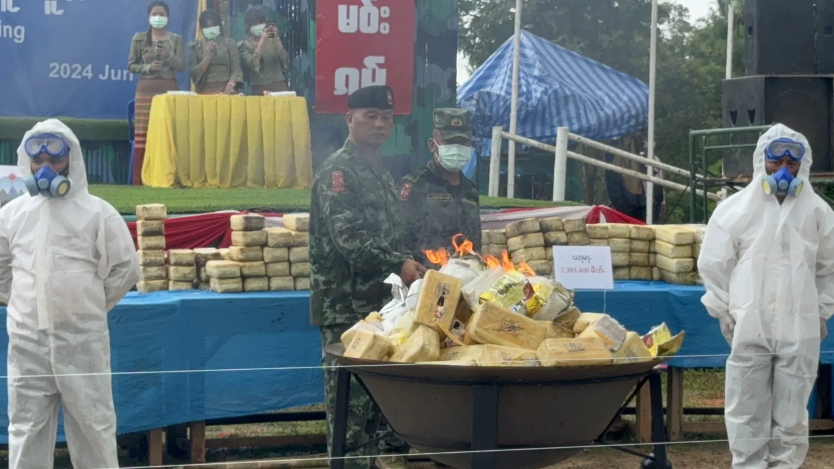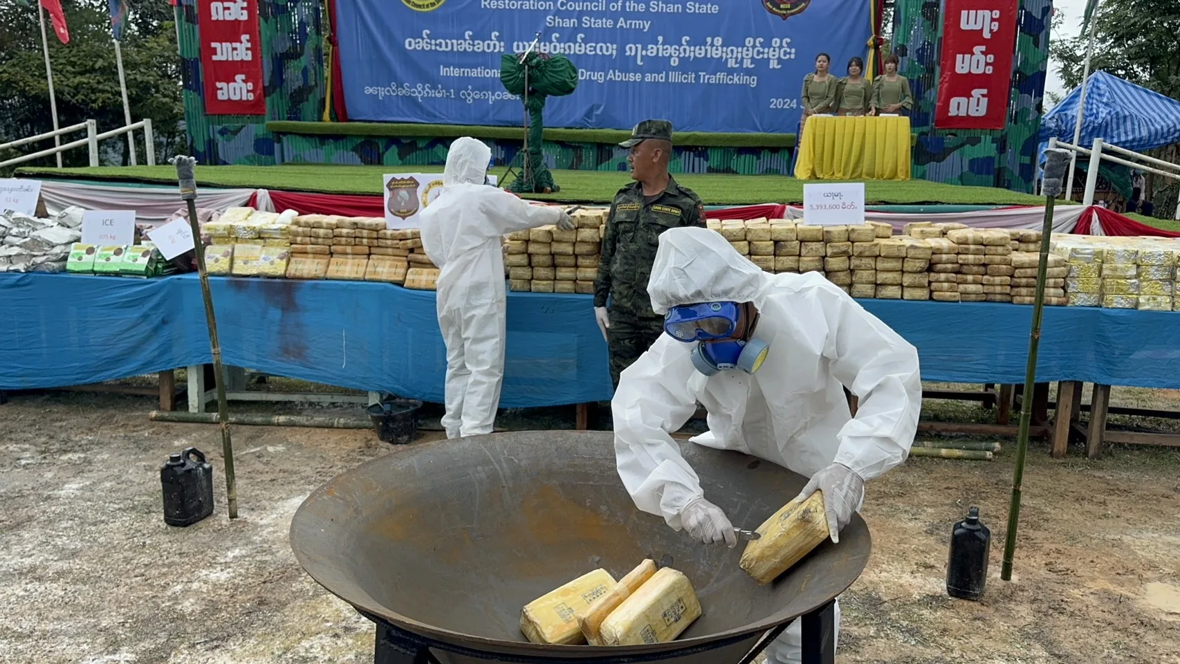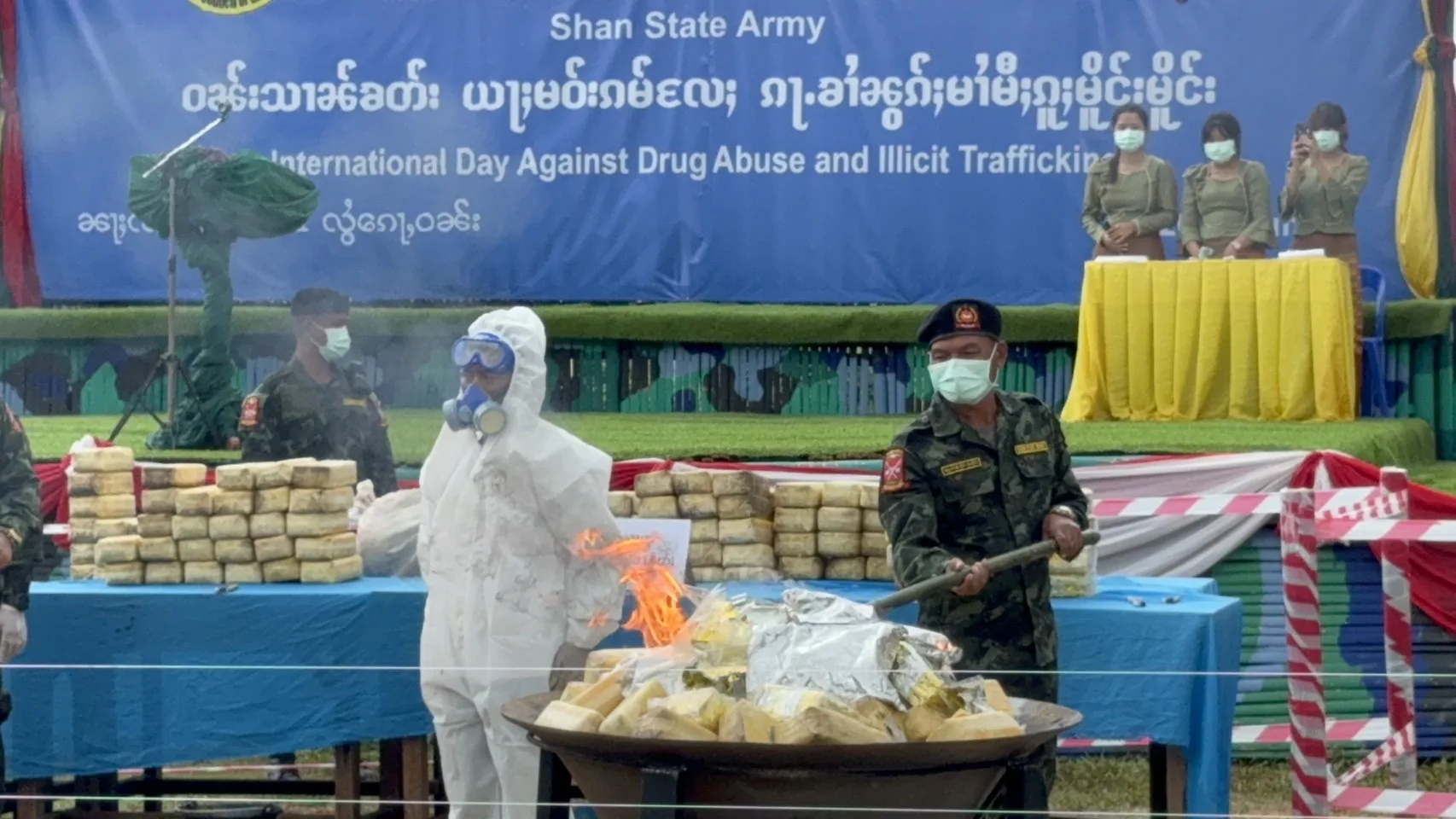 วันนี้ (26 มิ.ย.) กรณีกองกำลังภาคพื้นที่ 1 กองทัพรัฐฉาน (SSA) สภากอบกู้รัฐฉาน (RCSS) นำโดย พ.อ.คำก้อนจื้น ผู้บัญชาการกองกำลังภาคพื้นที่ 1 SSA ได้จัดกิจกรรมเนื่องในวันต่อต้านยาเสพติดโลกประจำปี 2567 โดยมีการเดินขบวน กล่าวสุนทรพจน์ และเผาทำลายยาเสพติดที่ยึดได้ตั้งแต่เดือน มิ.ย.2566-มิ.ย.2567 นี้เป็นยาบ้า 5,393,600 เม็ด เฮโรอีน 1 กิโลกรัม ยาไอซ์ 105 กิโลกรัม คาเฟอีน 51 กิโลกรัม น้ำยาผลิตยาเสพติด 20 ลิตร ผงสีสำหรับผลิตยาเสพติด 10 กิโลกรัม ซึ่งจับผู้กระทำผิด คนลำเลียงยาเสพติด13 คนพร้อมคนงานโรงงานผลิตยาเสพติด 15 คน ณ ฐานดอยก่อวันติดกับ อ.แม่ฟ้าหลวง จ.เชียงราย ของไทยนั้น