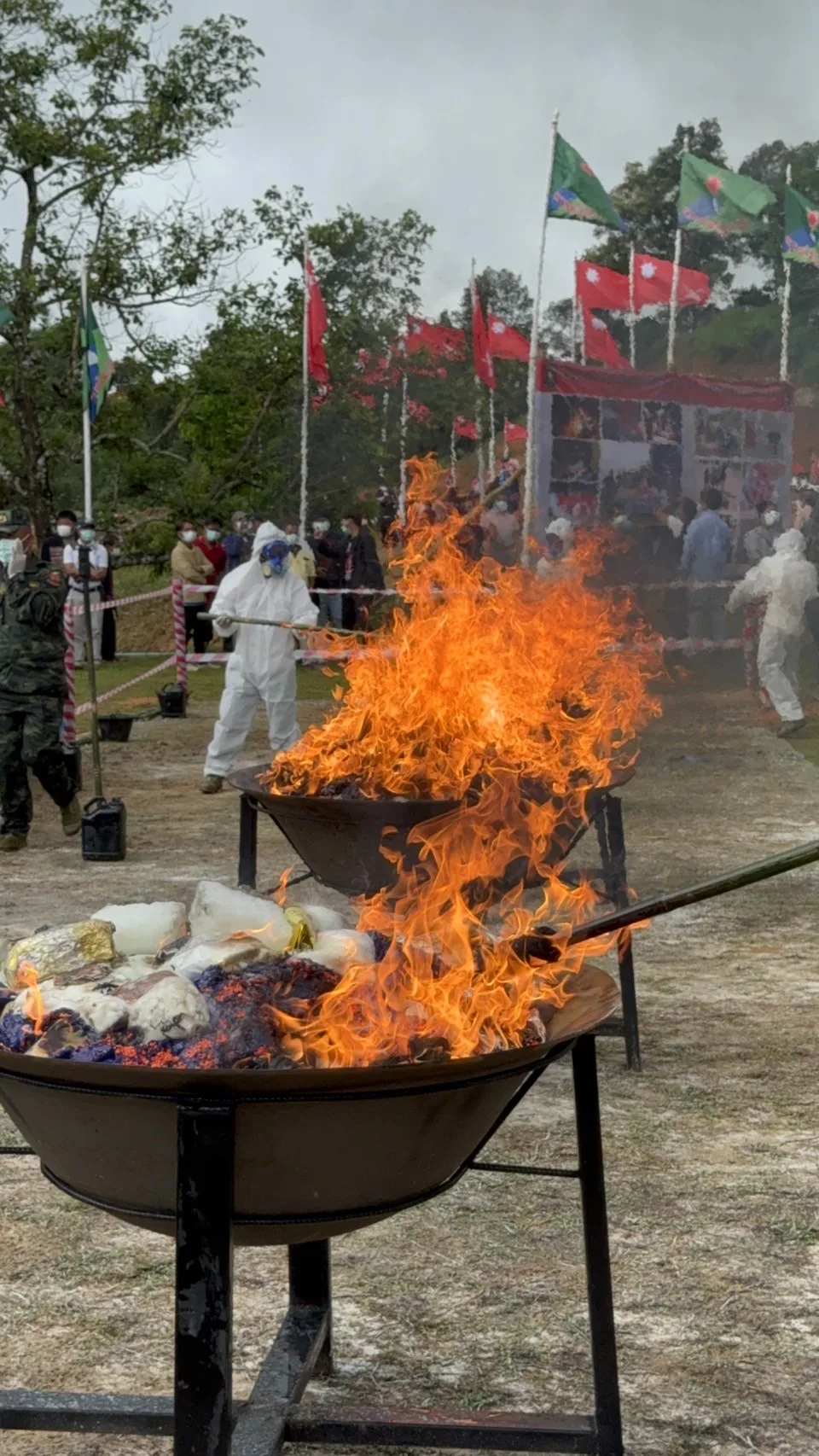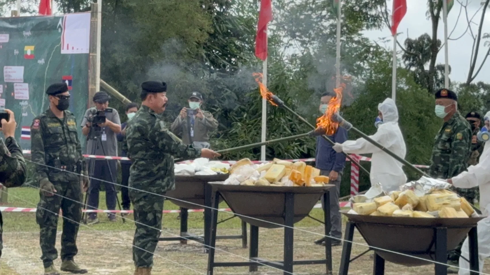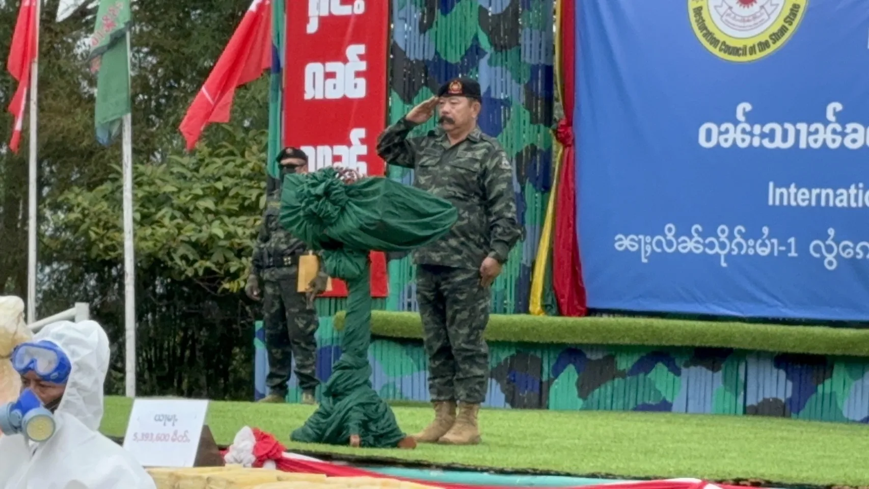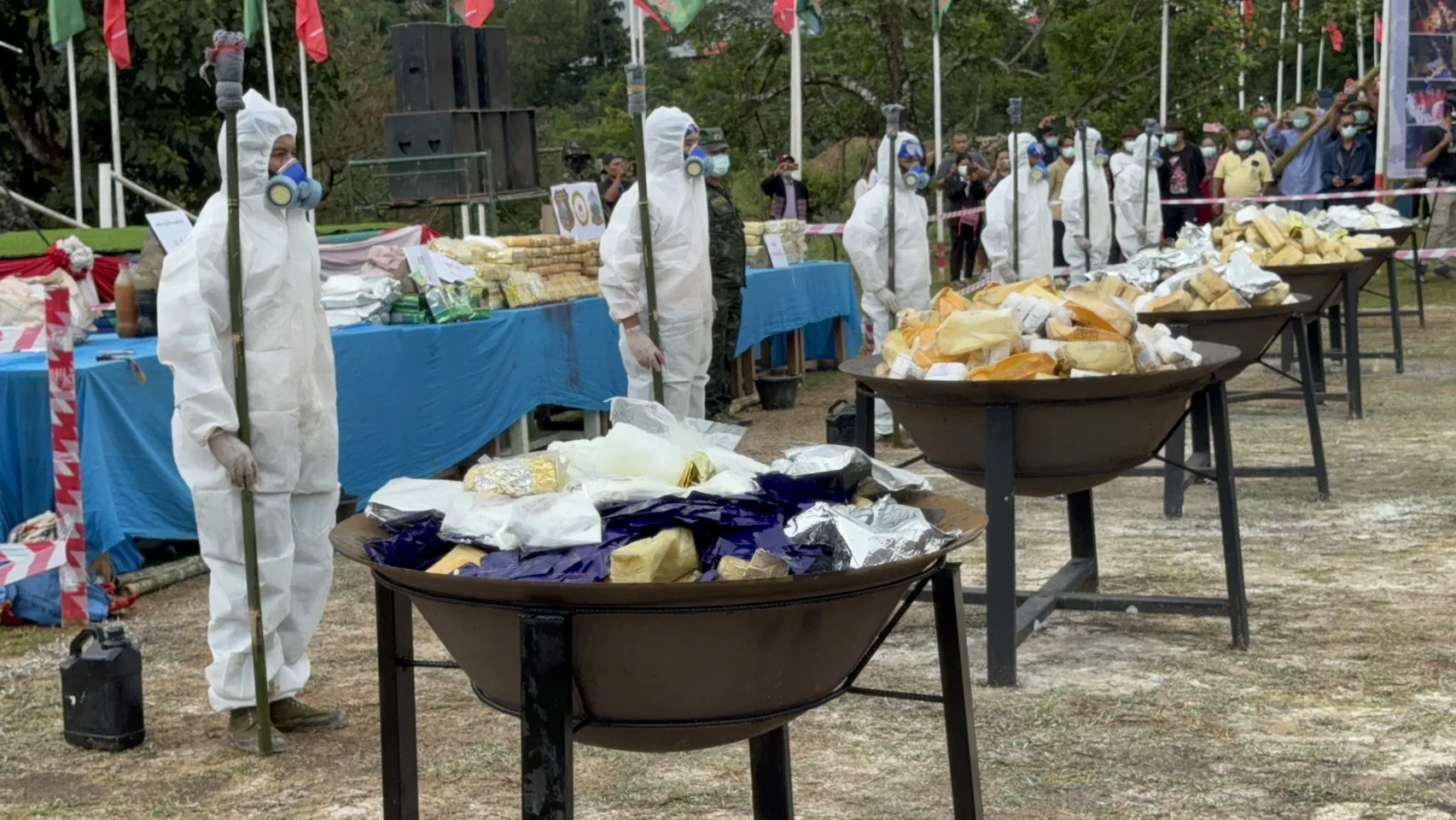 วันนี้ (26 มิ.ย.) กรณีกองกำลังภาคพื้นที่ 1 กองทัพรัฐฉาน (SSA) สภากอบกู้รัฐฉาน (RCSS) นำโดย พ.อ.คำก้อนจื้น ผู้บัญชาการกองกำลังภาคพื้นที่ 1 SSA ได้จัดกิจกรรมเนื่องในวันต่อต้านยาเสพติดโลกประจำปี 2567 โดยมีการเดินขบวน กล่าวสุนทรพจน์ และเผาทำลายยาเสพติดที่ยึดได้ตั้งแต่เดือน มิ.ย.2566-มิ.ย.2567 นี้เป็นยาบ้า 5,393,600 เม็ด เฮโรอีน 1 กิโลกรัม ยาไอซ์ 105 กิโลกรัม คาเฟอีน 51 กิโลกรัม น้ำยาผลิตยาเสพติด 20 ลิตร ผงสีสำหรับผลิตยาเสพติด 10 กิโลกรัม ซึ่งจับผู้กระทำผิด คนลำเลียงยาเสพติด13 คนพร้อมคนงานโรงงานผลิตยาเสพติด 15 คน ณ ฐานดอยก่อวันติดกับ อ.แม่ฟ้าหลวง จ.เชียงราย ของไทยนั้น