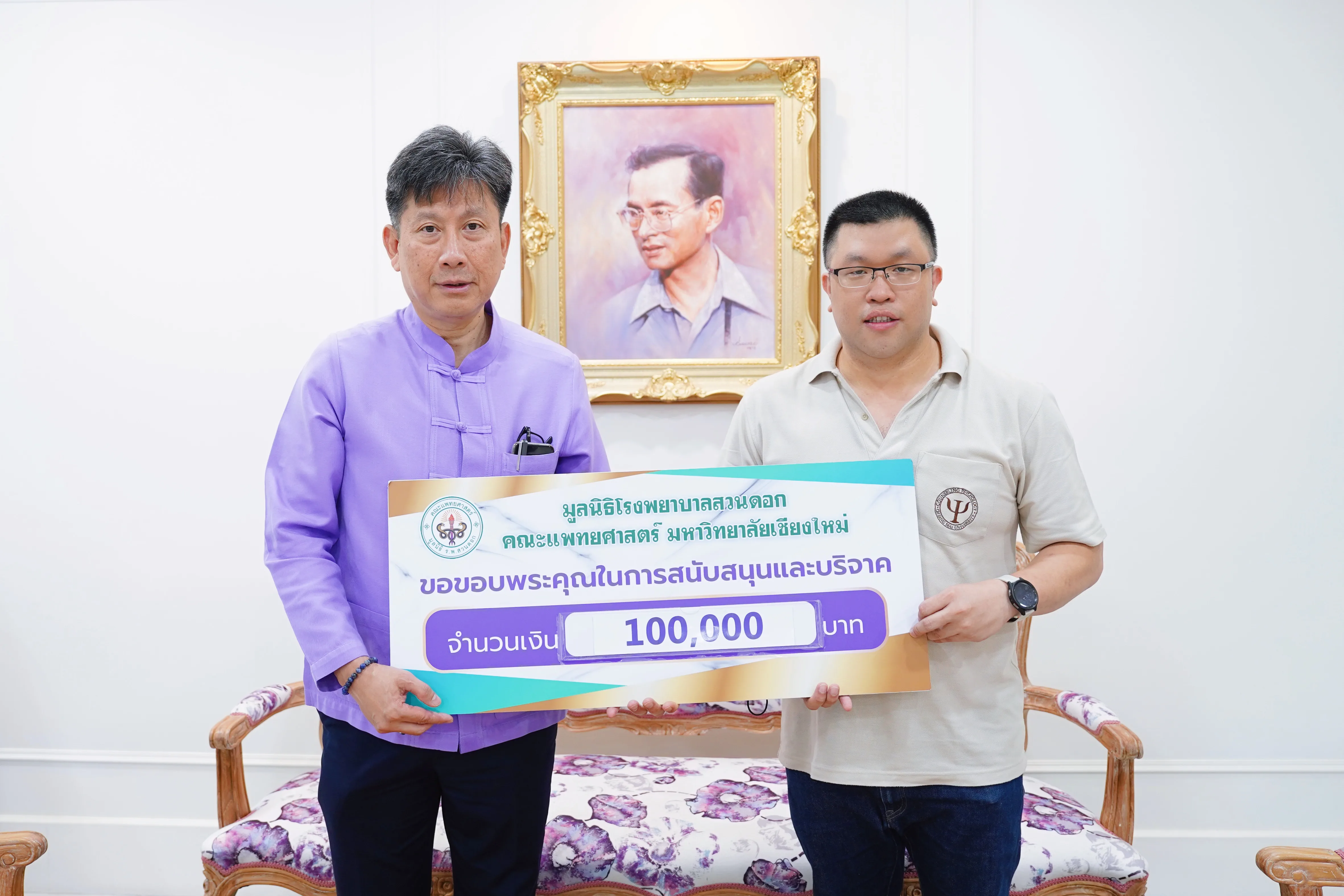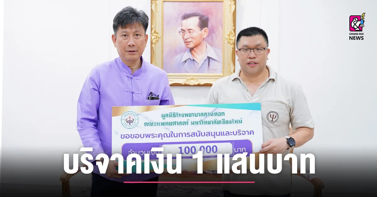 รศ.นพ.ณัฐพงศ์ โฆษชุณหนันท์ รองคณบดีคณะแพทยศาสตร์ มช. รับมอบเงินบริจาค 100,000 บาท จาก ผศ.ดร.ไชยันต์ สกุลศรีประเสริฐ พร้อมครอบครัว สมทบทุนมูลนิธิโรงพยาบาลสวนดอก เพื่อโครงการจัดซื้อครุภัณฑ์ทางการแพทย์อาคารสุจิณฺโณ ในวันที่ 27 มิถุนายน 2567 ณ ศาลาใต้ร่มพระบารมี ชั้น 1 อาคารสุจิณฺโณ คณะแพทยศาสตร์ มช.