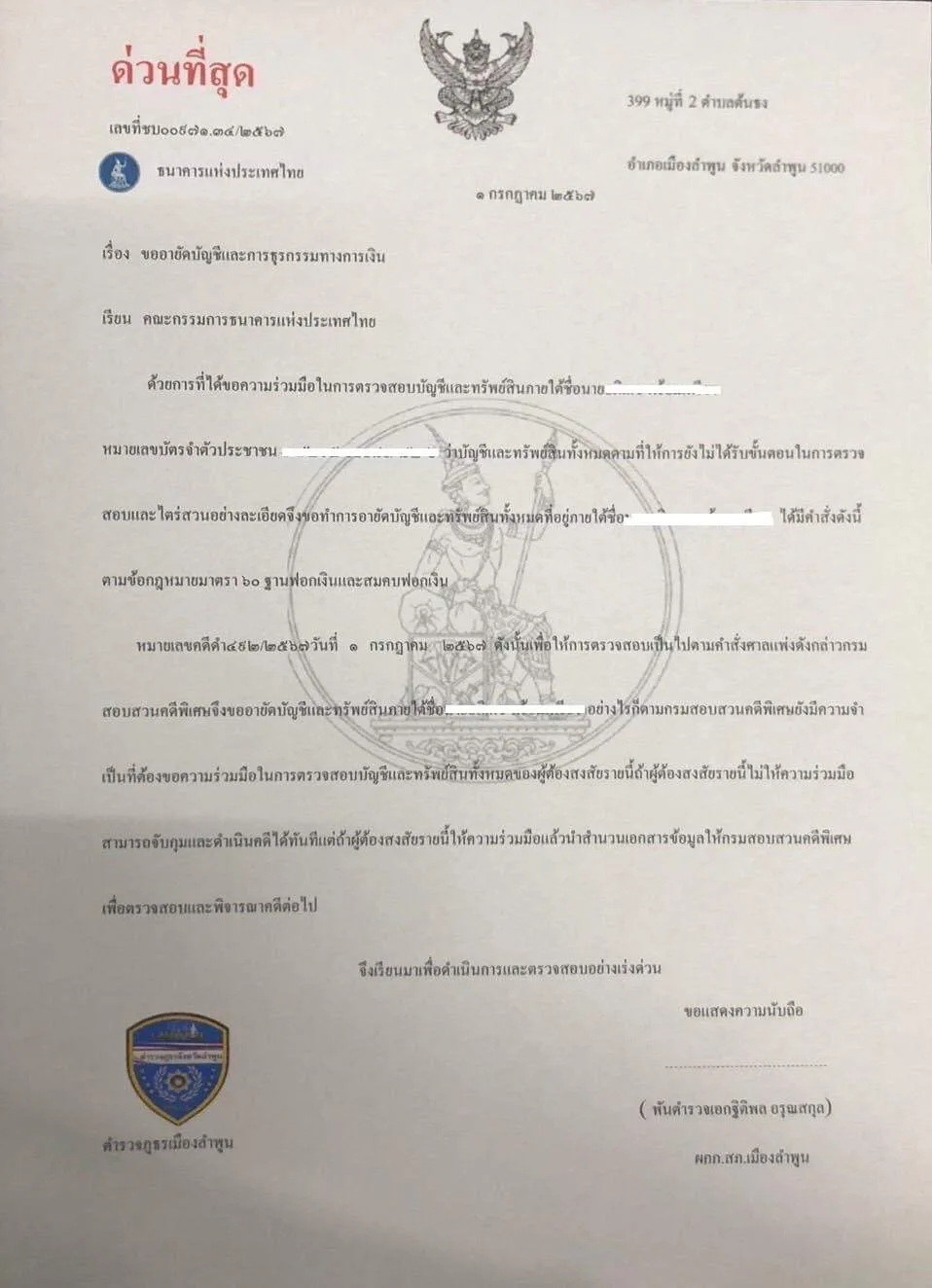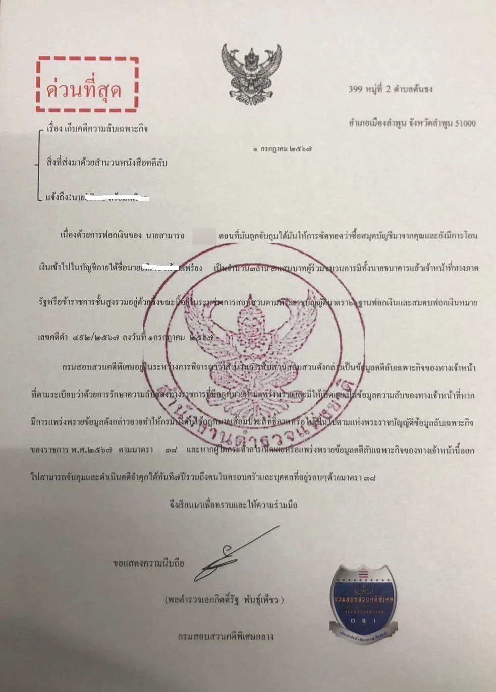 บุคคลนี้ แอบอ้างว่าเป็นตำรวจ สภ.เมืองลำพูน หลอกผู้เสียหายว่ามีส่วนเกี่ยวข้องกันการฟอกเงิน โดยใช้เอกสารปลอมเหล่านี้ ข่มขู่ผู้เสียหาย มีผู้เสียหายมีหลายรายแล้ว บางรายโอนไปจนหมดตัว