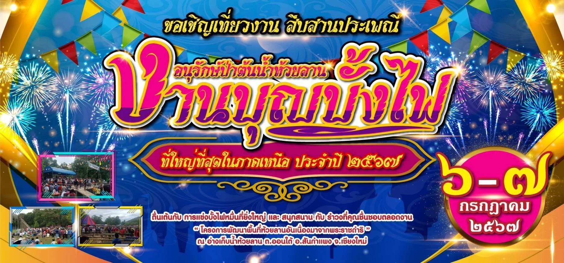 โดยมีกำหนดการดังนี้ วันที่ 6 ก.ค.2567 เวลา 09.00 น.ประเพณีเลี้ยงผีขุนน้ำห้วยลาน ณ ขุนน้ำห้วยลาน เจ้าพ่อขุนดง เจ้าพ่อหงส์ขาว เจ้าพ่อคิงส์คำ เวลา 08.00 น.พิธีจุดบั้งไฟเล็กถวายเป็นพุทธบูชา บูชาพระธาตุเกศแก้วจุฬามณี บนสรวงสวรรค์ื เวลา 08.19 น.พิธีแข่งขั้นบั่งไฟเล็ก ตลอดทั้งวันืจนมืดค่ำ เวลา 16.00 – 21.00 น.รำวงย้อนยุค ลานเบียร์ จำหน่ายสินค้า (ห้ามก่อเหตุความวุ่นวาย ถ้าก่อเหตุความวุ่นวาย ปรับ 5-6 หมื่นบาท และรับผิดชอบความเสียหายงานทั้งหมด)