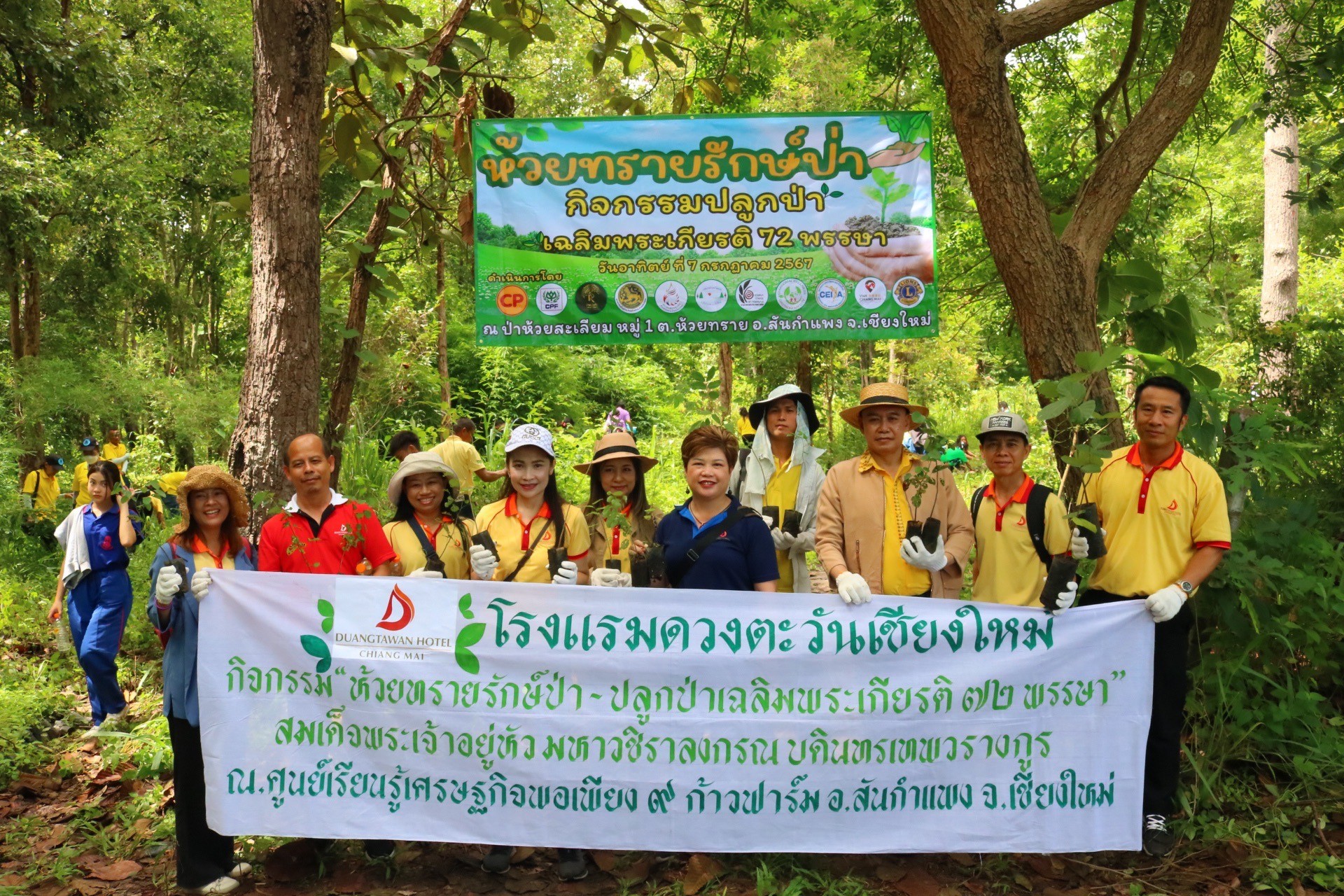 โรงแรมดวงตะวันเชียงใหม่ รวมพลังจิตอาสา ร่วมกิจกรรม “ ห้วยทรายรักษ์ป่า ” โดยร่วมกัน ปลูกป่าเฉลิมพระเกียรติ ๗๒ พรรษา ปลูกต้นไม้เพื่อเพิ่มพื้นที่ป่า ณ บริเวณป่าห้วยสะเลียม บ้านแม่ตาด ม.1 ต.ห้วยทราย อ. สันกำแพง จ.เชียงใหม่ โดยได้รับเกียรติจาก นายทศพล เผื่อนอุดม รองผู้ว่าราชการจังหวัดเชียงใหม่ มาเป็นประธานเปิดงานโครงการห้วยทรายรักษ์ป่าและการปลูกป่าเฉลิมพระเกียรติ 72 พรรษา ณ ศูนย์เรียนรู้เศรษฐกิจพอเพียง ๙ ก้าวฟาร์ม ต.ห้วยทราย อ.สันกำแพง จ.เชียงใหม่ ร่วมกับสมาคมนิเวศนวัตกรรมเชียงใหม่ นายอำเภอและชุมชนชาวบ้าน อ.สันกำแพง ตัวแทนภาครัฐและเอกชนในจังหวัดเชียงใหม่
