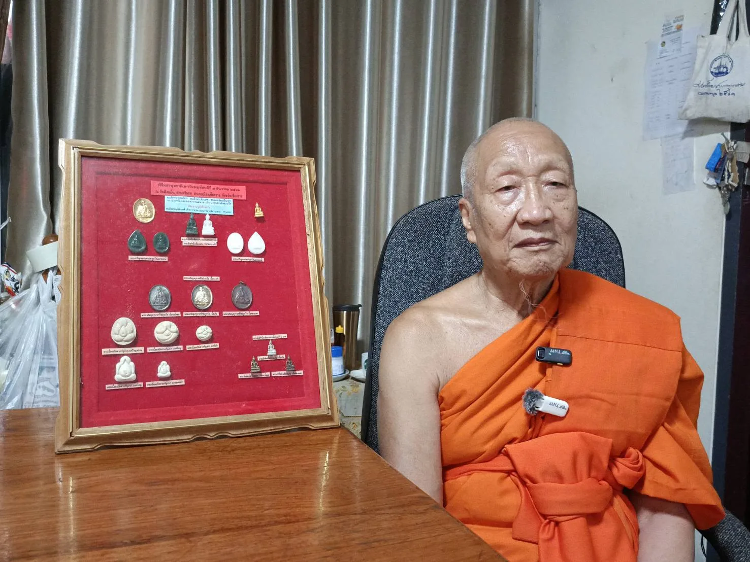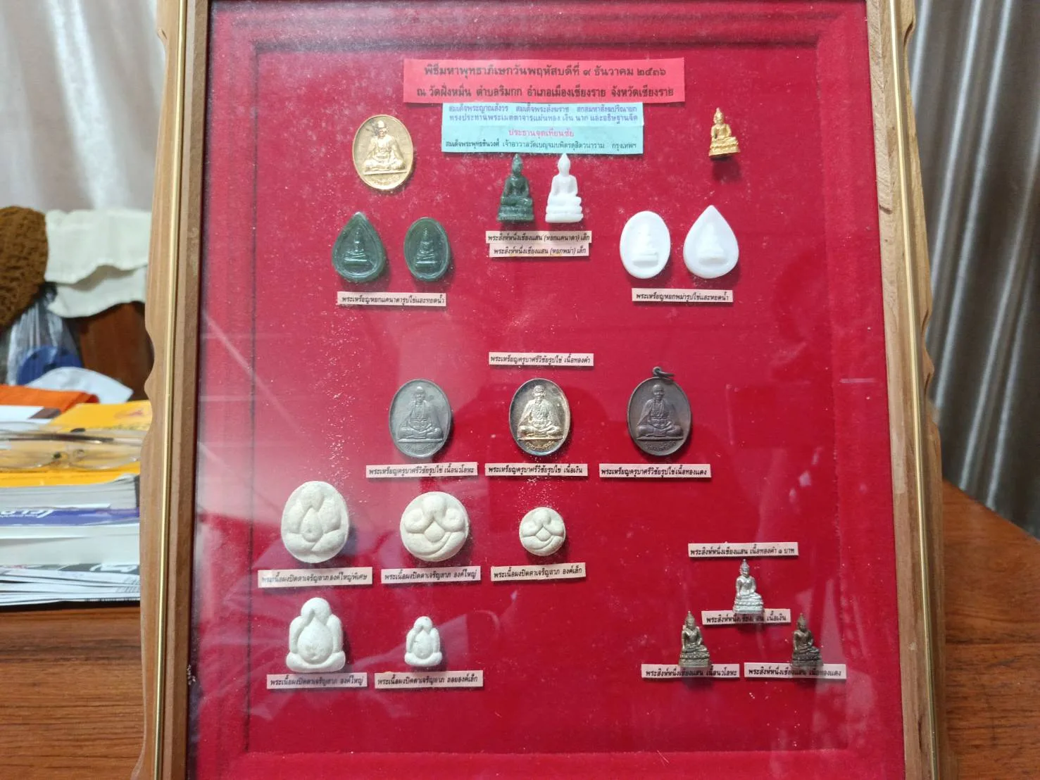 เจ้าอาวาสวัดฝั่งหมิ่น เล่าอีกว่า หลังจากได้มาเป็นเจ้าอาวาสวัดฝั่งหมิ่น เป็นรูปที่ 19 ก็ได้มีแนวคิดจะสร้างวัตถุมงคลขึ้นมาจำนวนหนึ่ง มีทั้งเหรียญครูบาศรีวิชัย เหรียญหลวงพ่อคูณ พระหยก พระผงปิดตา รวมไปถึงพระพุทธรูปสิงห์หนึ่ง เพื่อหาทุนสร้างอาคารพิพิธภัณฑ์และศูนย์ศิลปพื้นบ้าน โดยพิธีพุทธาภิเษกวัตถุมงคล เมื่อวันที่ 9 ธ.ค. 2536 ซึ่งได้มีพระเกจิอาจารย์จากทั่วสารทิศ ทั้งชาวไทยและต่างชาติ มาร่วมในพิธีเป็นจำนวนมาก นำโดยหลวงพ่อคูณปริสุทโธ วัดป่าบ้านไร่ จ.นครราชสีมา ซึ่งวัตถุมงคลที่สร้างและเปิดให้เช่าบูชาในครั้งนั้นได้รับความสนใจเป็นจำนวนมาก จนสามารถดำเนินก่อสร้างอาคารพิพิธภัณฑ์และศูนย์ศิลปพื้นบ้านได้ตามวัตถุประสงค์ที่ตั้งไว้