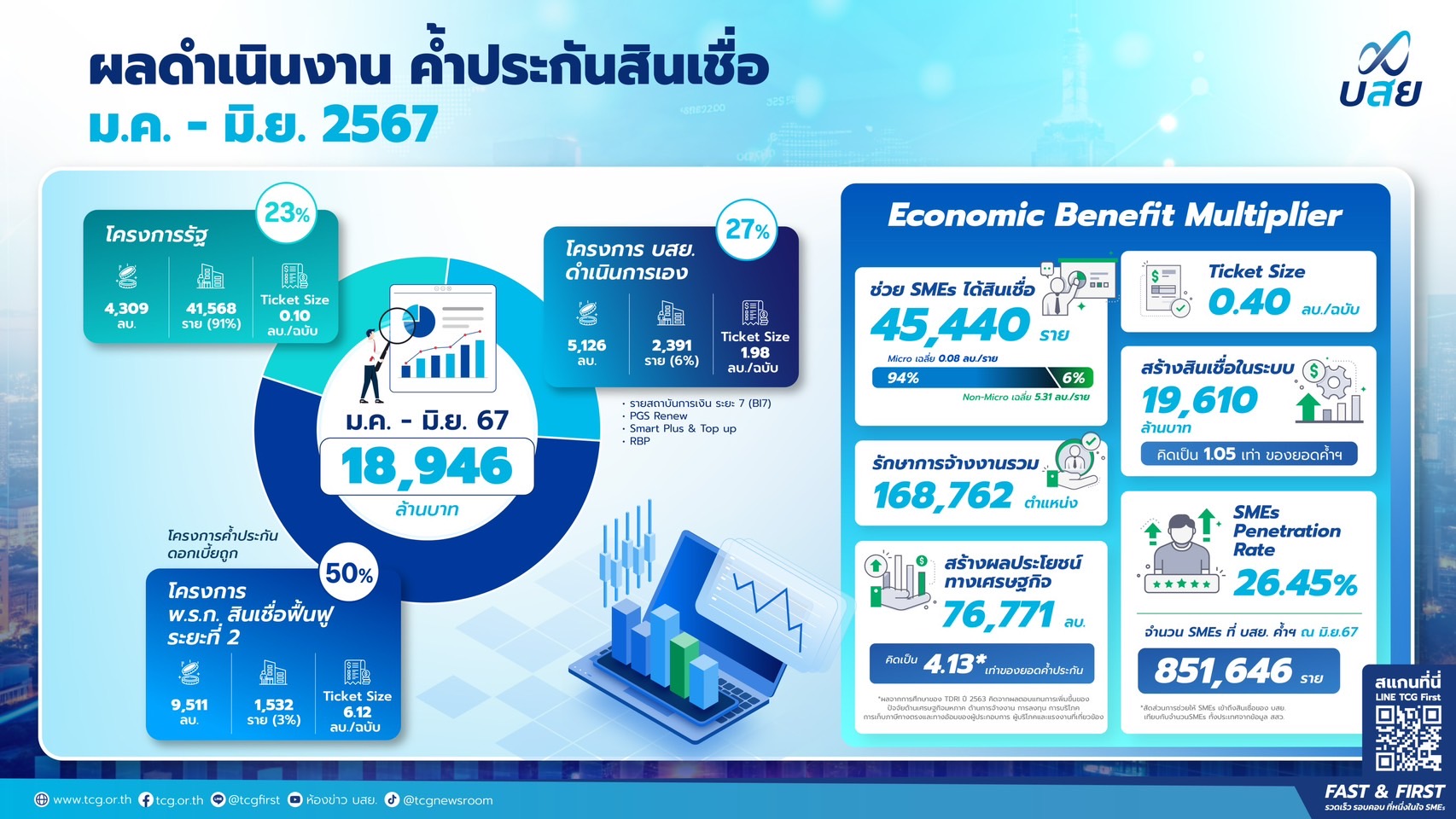 บสย. เร่งฟื้น SMEs ม.ค. – มิ.ย. 67 ค้ำแล้ว 18,946 ล้านบาท ชูแผนครึ่งปีหลัง เร่งค้ำ ต่อเนื่อง มั่นใจ “บสย. SMEs ยั่งยืน” ครึ่งปีหลัง ช่วย SMEs ได้สินเชื่อกว่า 30,000 ราย มั่นใจมาตรการรัฐ “ฟรีค่าธรรมเนียม 2-4 ปีแรก” หนุนแบงก์ปล่อยสินเชื่อ