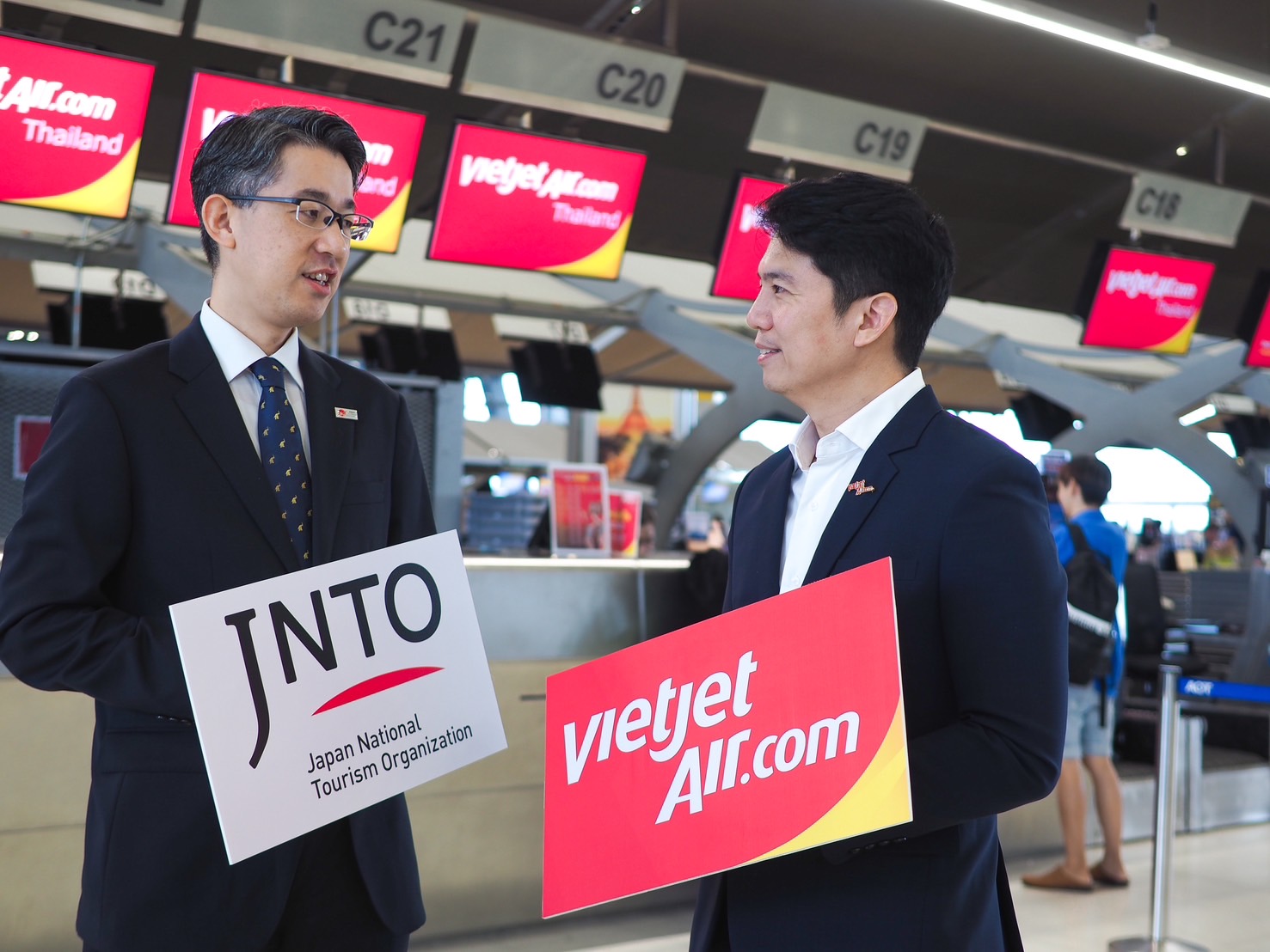 Mr. Hajime Nakasugi, Executive Director องค์การส่งเสริมการท่องเที่ยวแห่งประเทศญี่ปุ่น (JNTO) สำนักงานกรุงเทพฯ กล่าวว่า “เรามีความยินดีเป็นอย่างยิ่งที่ได้ร่วมมือกับเวียตเจ็ทไทยแลนด์เพื่อส่งเสริมเส้นทางบินสู่ประเทศญี่ปุ่น เวียตเจ็ทไทยแลนด์เป็นพันธมิตรที่สำคัญของเรา โดยเป็นกำลังสำคัญในการให้บริการการเดินทางทางอากาศระหว่างประเทศไทยและญี่ปุ่น JNTO จะเดินหน้าส่งเสริมการท่องเที่ยวญี่ปุ่นโดยแนะนำเสน่ห์อันหลากหลายของญี่ปุ่นแก่นักท่องเที่ยวชาวไทยต่อไป”