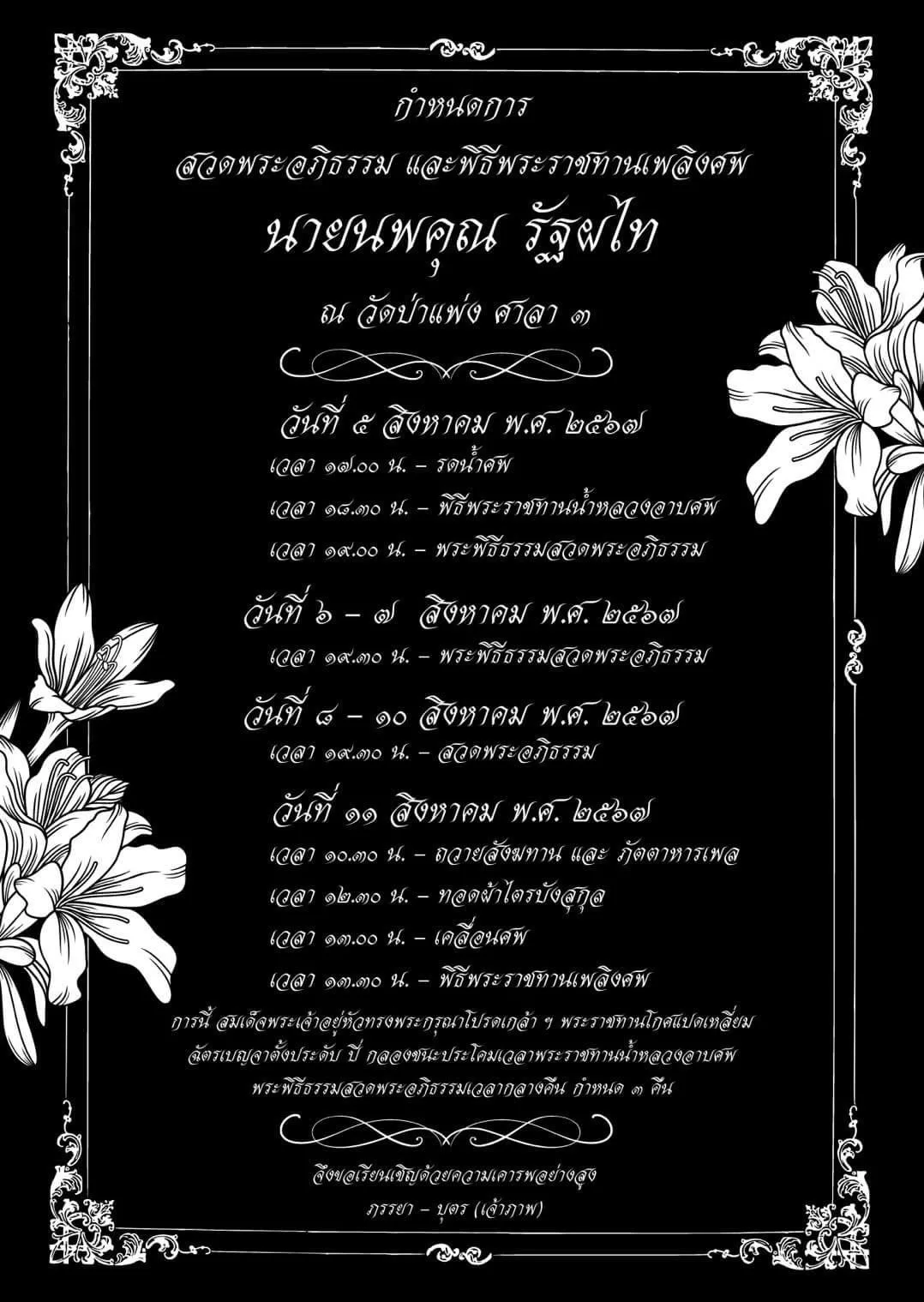 โดยมีกำหนดการกำหนดการสวดพระอภิธรรม และพิธีพระราชทานเพลิงศพ