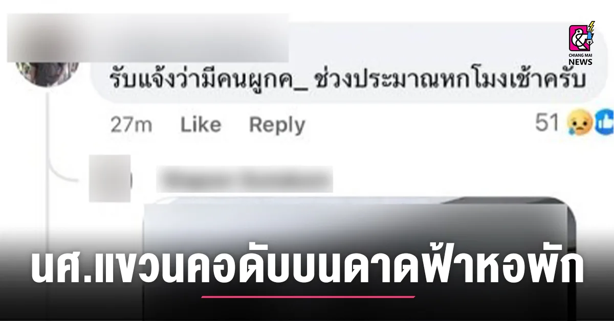 เมื่อเช้าวันที่ 5 ส.ค. 2567 ทางศูนย์วิทยุกองบังคับการตำรวจภูธรจังหวัดเชียงใหม่ ได้รับแจ้งมีเหตุนักศึกษามหาวิทยาลัยของเชียงใหม่ ทำการแขวนคอเสียชีวิต ที่หอพัก บนดาดฟ้า จึงรายงานให้ผุ้บังคับบัญชาทราบตามลำดับชั้นและแจ้งให้พนักงานสอบสวน สภ.เขตที่รับผิดชอบในพื้นที่(สภ ภูพิงค์) ไปตรวจสอบยังที่เกิดเหตุพร้อมด้วย หน่วยกู้ภัยมูลนิธิรวมใจ เจ้าหน้าที่แพทย์เวร จาก รพ.มหาราชนครเชียงใหม่ ทางศูนย์วิทยุฯ และพนักงานสอบสวน เจ้าหน้าที่ได้รับแจ้งประมาณ 06.30 น .