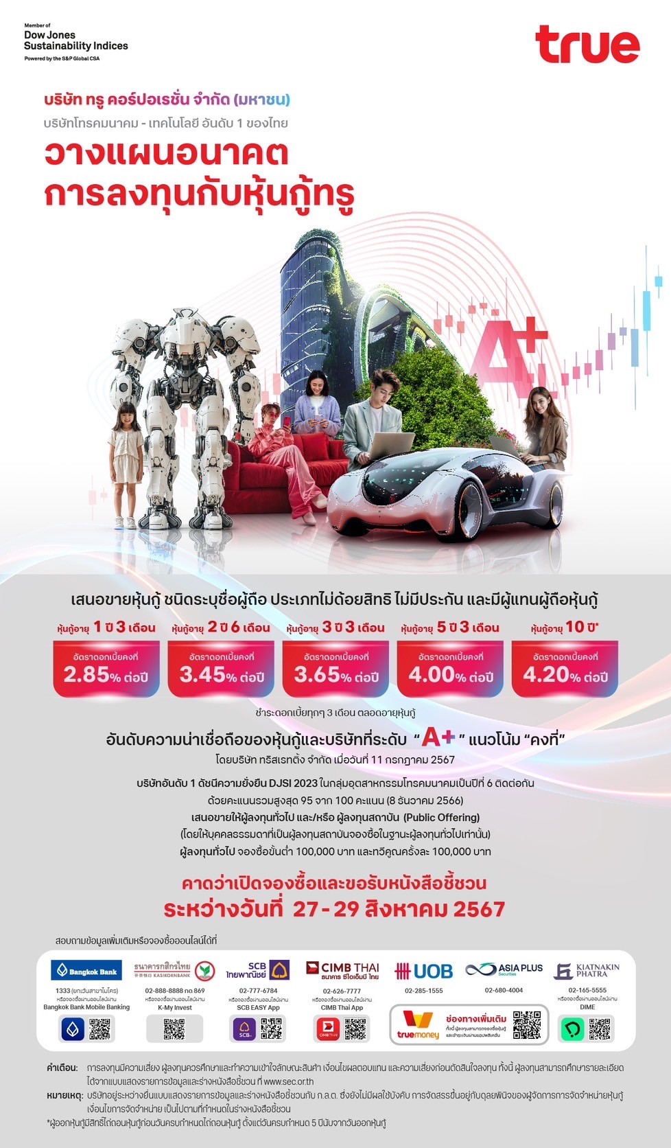 กรุงเทพฯ : 13 สิงหาคม 2567 – ทรู คอร์ปอเรชั่น บริษัทโทรคมนาคม-เทคโนโลยี ชั้นนำอันดับ 1 ของไทย และอันดับ 1 ของโลกด้านความยั่งยืน ด้วยคะแนน DJSI 2023 สูงสุดในกลุ่มอุตสาหกรรมโทรคมนาคมเป็นปีที่ 6 ติดต่อกัน ประกาศดอกเบี้ยหุ้นกู้ชุดใหม่ ผลตอบแทนระหว่าง 2.85-4.20% ต่อปี โดยมีหุ้นกู้เสนอขายจำนวน 5 รุ่น ตั้งแต่อายุหุ้นกู้ 1 ปี 3 เดือน ถึง 10 ปี เพื่อรองรับความต้องการของนักลงทุนทุกกลุ่ม ด้วยอันดับความน่าเชื่อถือระดับ “A+” แนวโน้ม “คงที่” (Stable) จากทริสเรทติ้ง ตอกย้ำสถานะที่แข็งแกร่งของบริษัททรู คอร์ปอเรชั่นที่มีความมั่นคงทั้งในธุรกิจโทรคมนาคม และธุรกิจเทคโนโลยีดิจิทัล คาดเปิดให้จองซื้อระหว่างวันที่ 27 – 29 สิงหาคม พ.ศ. 2567 โดยมีธนาคารกรุงเทพ กสิกรไทย ไทยพาณิชย์ ซีไอเอ็มบี ยูโอบี บริษัทหลักทรัพย์เกียรตินาคินภัทร และบริษัทหลักทรัพย์ เอเซีย พลัส เป็นผู้จัดการการจัดจำหน่ายหุ้นกู้ รวมถึงการขายผ่านแอปพลิเคชัน TrueMoney Wallet