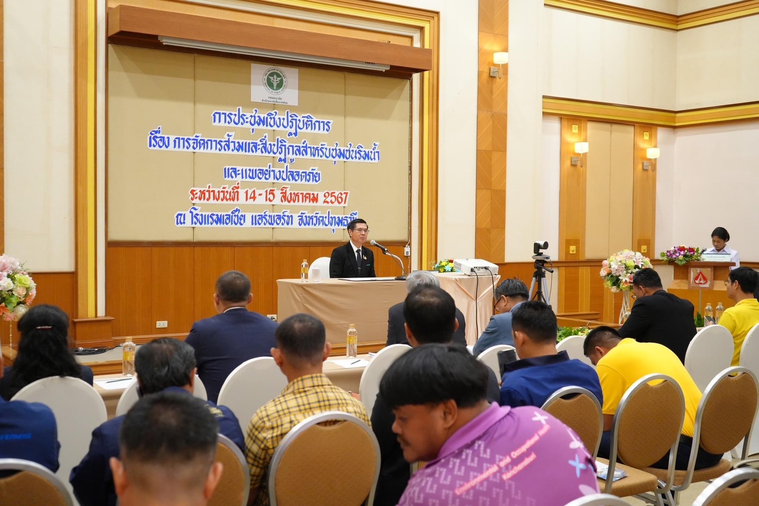 วันที่ 15 สิงหาคม 2567 กรมอนามัย จัดประชุมเชิงปฏิบัติการ เรื่อง การจัดการส้วมและสิ่งปฏิกูลสำหรับชุมชนริมน้ำและแพอย่างปลอดภัย ณ โรงแรมเอเชีย แอร์พอร์ท จังหวัดปทุมธานี โดยมีนายแพทย์อรรถพล แก้วสัมฤทธิ์ รองอธิบดีกรมอนามัย เป็นประธาน พร้อมด้วยนางไฉไล ช่างดำ รักษาการนักวิชาการสาธารณสุขทรงคุณวุฒิ (ด้านสุขาภิบาล) และนางณีรนุช อาภาจรัส ผู้อำนวยการสำนักอนามัยสิ่งแวดล้อม ซึ่งการประชุมครั้งนี้มีวัตถุประสงค์เพื่อสร้างความรู้ความเข้าใจที่ถูกต้องและสร้างความร่วมมือระหว่างหน่วยงานด้านการจัดการส้วมและสิ่งปฏิกูลสำหรับชุมชนริมน้ำและแพอย่างครบวงจร ป้องกันการแพร่ของเชื้อโรคและหนอนพยาธิสู่แหล่งน้ำ ตลอดจนผลกระทบต่อสิ่งแวดล้อมและสุขภาพของประชาชน
