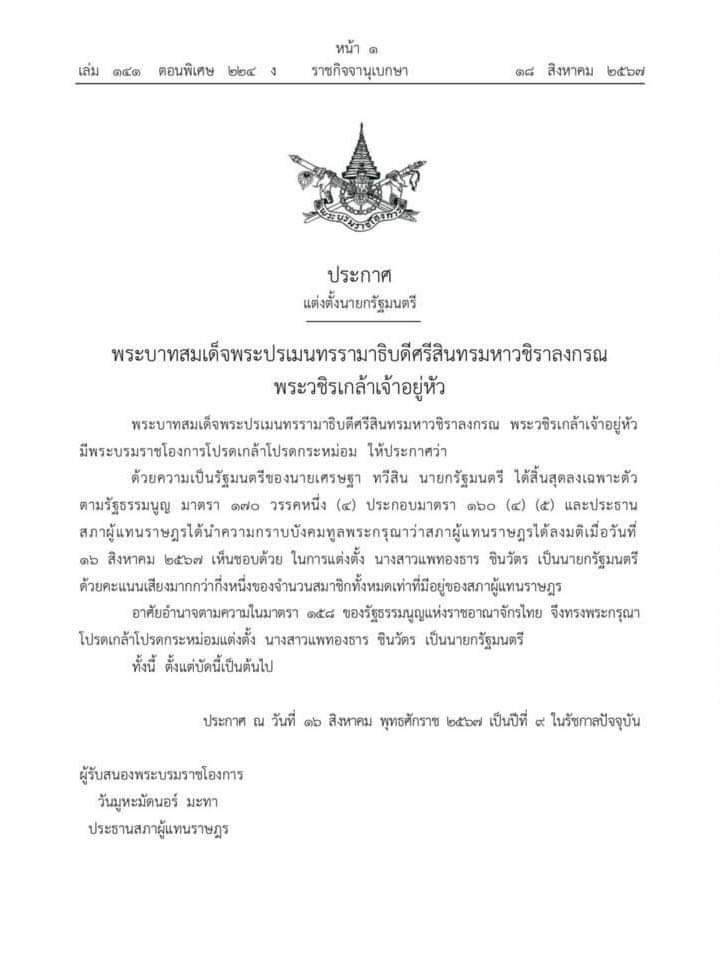 ราชกิจจานุเบกษา ประกาศแต่งตั้ง “แพทองธาร ชินวัตร” เป็นนายกรัฐมนตรี