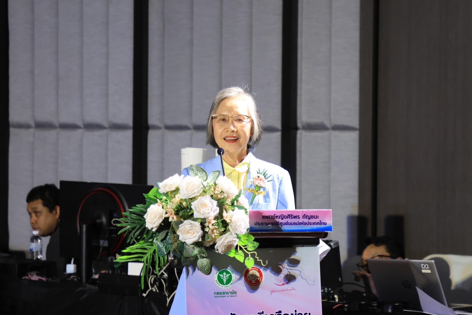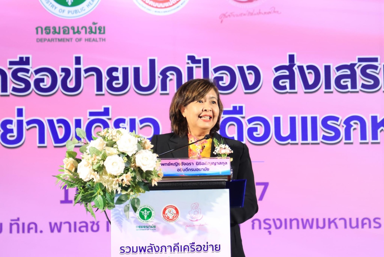 แพทย์หญิงอัจฉรา นิธิอภิญญาสกุล อธิบดีกรมอนามัย กล่าวว่า จากการสำรวจสถานการณ์เด็กและสตรีในประเทศไทย โดยสำนักงานสถิติแห่งชาติร่วมกับองค์การทุนเพื่อเด็กแห่งสหประชาชาติ ในปี 2565 พบว่ามีทารกไทยร้อยละ 29.4 ได้กินนมแม่ ภายใน 1 ชั่วโมงแรกหลังคลอด และมีเพียงร้อยละ 28.6 ที่ได้กินนมแม่อย่างเดียวในช่วง 6 เดือนแรกของชีวิต ยิ่งไปกว่านั้น มีทารกเพียงร้อยละ 18.7 ที่ได้กินนมแม่ต่อเนื่องถึง 2 ปี ซึ่งการให้นมแม่ถือเป็นจุดเริ่มต้นแรกของการวางรากฐานคุณภาพชีวิตของคน นมแม่ช่วยสร้างภูมิคุ้มกัน ส่งเสริมการเจริญเติบโต ส่งเสริมพัฒนาการทั้งกายและใจ ลดการเสียชีวิตของมารดาและทารกหลังคลอด อีกทั้ง นมแม่ยังมีประโยชน์ต่อสิ่งแวดล้อมด้วย เพราะนมแม่เป็นอาหารจากธรรมชาติที่แท้จริง ไม่จำเป็นต้องใช้ทรัพยากรทางธรรมชาติหรือผ่านกระบวนการผลิตใด ๆ “กรมอนามัยได้เห็นความสำคัญของการเลี้ยงลูกด้วยนมแม่ จึงกำหนดนโยบาย มาตรการและดำเนินงานเพื่อปกป้อง ส่งเสริม และสนับสนุนการเลี้ยงลูกด้วยนมแม่มาอย่างต่อเนื่องร่วมกับภาคีเครือข่ายทุกภาคส่วน ดังนี้ 1) การขับเคลื่อนพระราชบัญญัติควบคุมการส่งเสริมการตลาดอาหารสำหรับทารกและเด็กเล็ก พ.ศ. 2560 เพื่อเป็นการปกป้องสิทธิและสุขภาพของเด็กทุกคนไม่ให้เสียโอกาสในการกินนมแม่ผ่านการควบคุมวิธีการโฆษณาและการส่งเสริมการตลาดอาหารทารกและเด็กเล็กให้เหมาะสม 2) การขับเคลื่อนการจัดบริการตามมาตรฐานโรงพยาบาลสายสัมพันธ์แม่ลูก โดยจัดระบบบริการที่มีคุณภาพให้แก่แม่และครอบครัว แม่จะได้รับการดูแลและเตรียมพร้อมสำหรับการเลี้ยงลูกด้วยนมแม่ตั้งแต่ตั้งครรภ์จนกระทั่งคลอด และกลับไปสู่ในชุมชน โดยเฉพาะใน 1 ชั่วโมงแรกหลังคลอด ลูกควรได้กินนมแม่ทันที เพราะนอกจากลูกจะได้ความอบอุ่นผ่านการโอบกอดแล้ว ยังเป็นจุดเริ่มต้นของการกระตุ้นให้เซลล์สมองที่มี 100 ล้านล้านเซลล์เกิดการเชื่อมต่ออย่างรวดเร็ว และเริ่มกระบวนการผลิตน้ำนม จะช่วยเพิ่มโอกาสการเลี้ยงลูกด้วยนมแม่ให้สำเร็จ ในช่วงเวลาพิเศษนี้เราเรียกว่า “ชั่วโมงทอง” และ 3) การผลักดันนโยบายส่งเสริมและสนับสนุนสภาพแวดล้อมที่เอื้อต่อการเลี้ยงลูกด้วยนมแม่ โดยขับเคลื่อนนโยบายการลาคลอด 180 วัน การจัดตั้งมุมนมแม่ในสถานประกอบกิจการสำหรับแม่ที่ต้องการบีบเก็บน้ำนมในเวลาทำงาน รวมถึงการจัดบริการขนส่งนมแม่โดยไม่เสียค่าใช้จ่าย เพื่ออำนวยความสะดวกในการส่งน้ำนมแช่แข็งและช่วยลดภาระค่าใช้จ่ายในการจัดส่ง และเน้นย้ำในช่วง 6 เดือนแรกลูกต้องได้กินนมแม่ล้วนโดยไม่ต้องผสมน้ำ” อธิบ