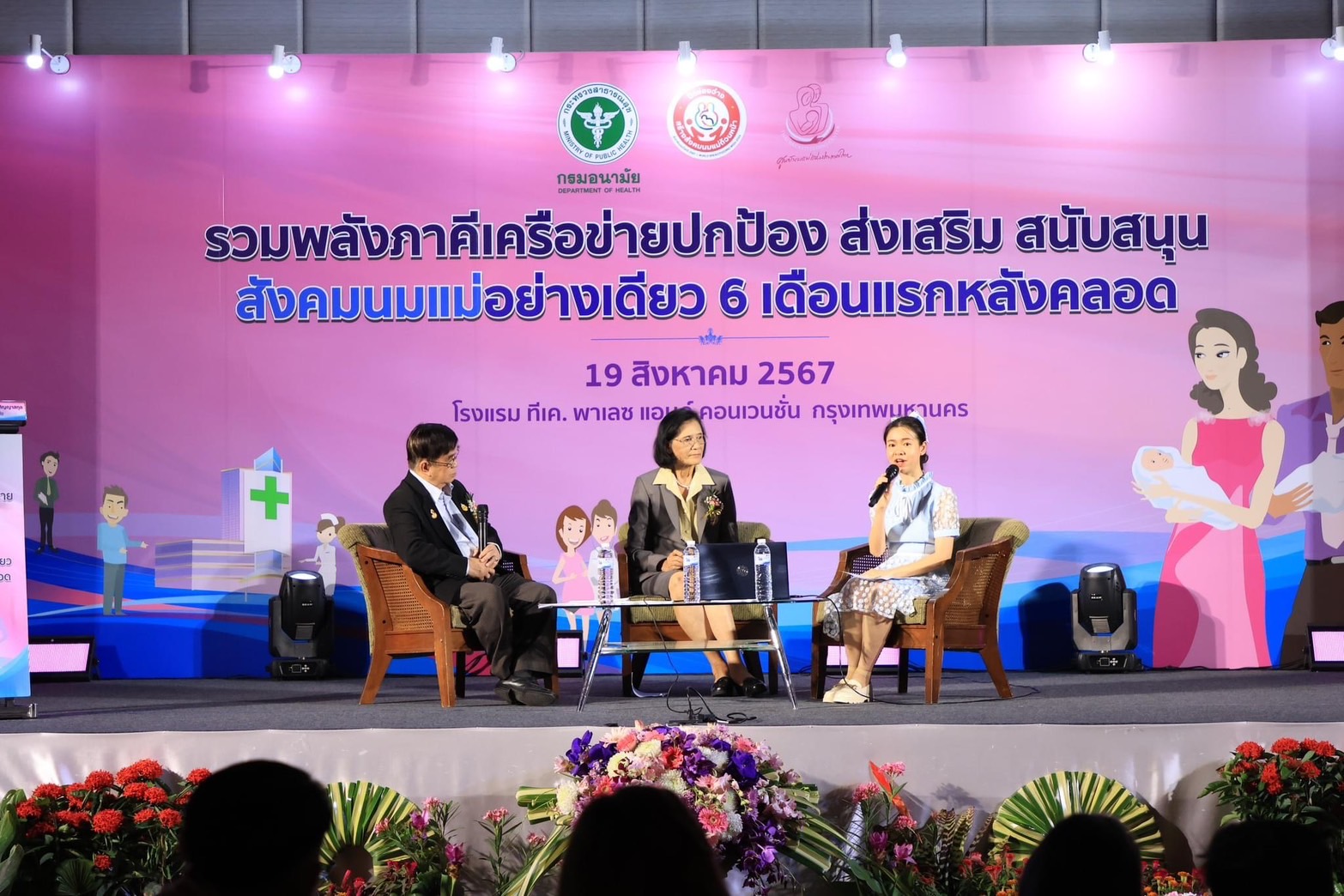 วันที่ 19 สิงหาคม 2567 แพทย์หญิงอัจฉรา นิธิอภิญญาสกุล อธิบดีกรมอนามัย เป็นประธานในพิธีเปิดงาน KICK OFF รวมพลังภาคีเครือข่ายปกป้อง ส่งเสริม สนับสนุนสังคมนมแม่อย่างเดียว 6 เดือนแรกหลังคลอด พร้อมด้วย แพทย์หญิงศิริพร กัญชนะ ประธานมูลนิธิศูนย์นมแม่แห่งประเทศไทย นายแพทย์เอกชัย เพียรศรีวัชรา รองอธิบดีกรมอนามัย แพทย์หญิงนงนุช ภัทรอนันตนพ รองอธิบดีกมอนามัย นายแพทย์ปกรณ์ ตุงคะเสรีรักษ์ ผู้ช่วยอธิบดีกรมอนามัย และผู้อำนวยการสำนักส่งเสริมสุขภาพ ผู้บริหารจากกรมอนามัย ผู้บริหารจากมูลนิธิศูนย์นมแม่แห่งประเทศไทย และภาคีเครือข่ายร่วมงาน ณ โรงแรมทีเค. พาเลซ แอนด์ คอนเวนชั่น แจ้งวัฒนะ กรุงเทพมหานคร