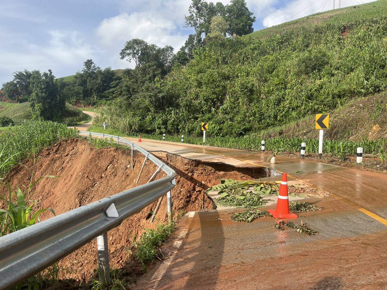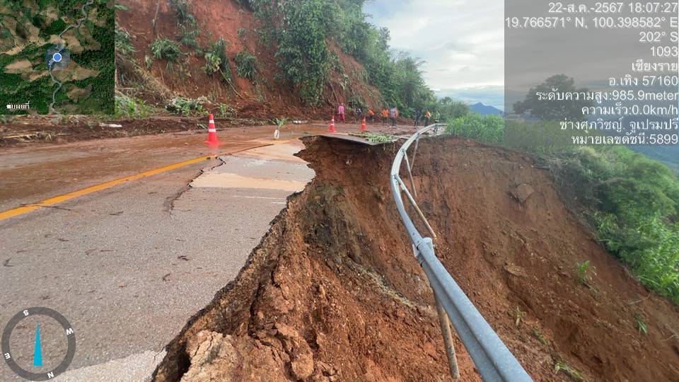 ถนน 1093 เส้นทางภูซาง-ภูชี้ฟ้า-ผาตั้ง ดินสไลด์-ถนนทรุด แนะรถยนต์ควรหลีกเลี่ยงเส้นทาง หลายหน่วยงานเร่งบรรเทาความเดือดร้อน
