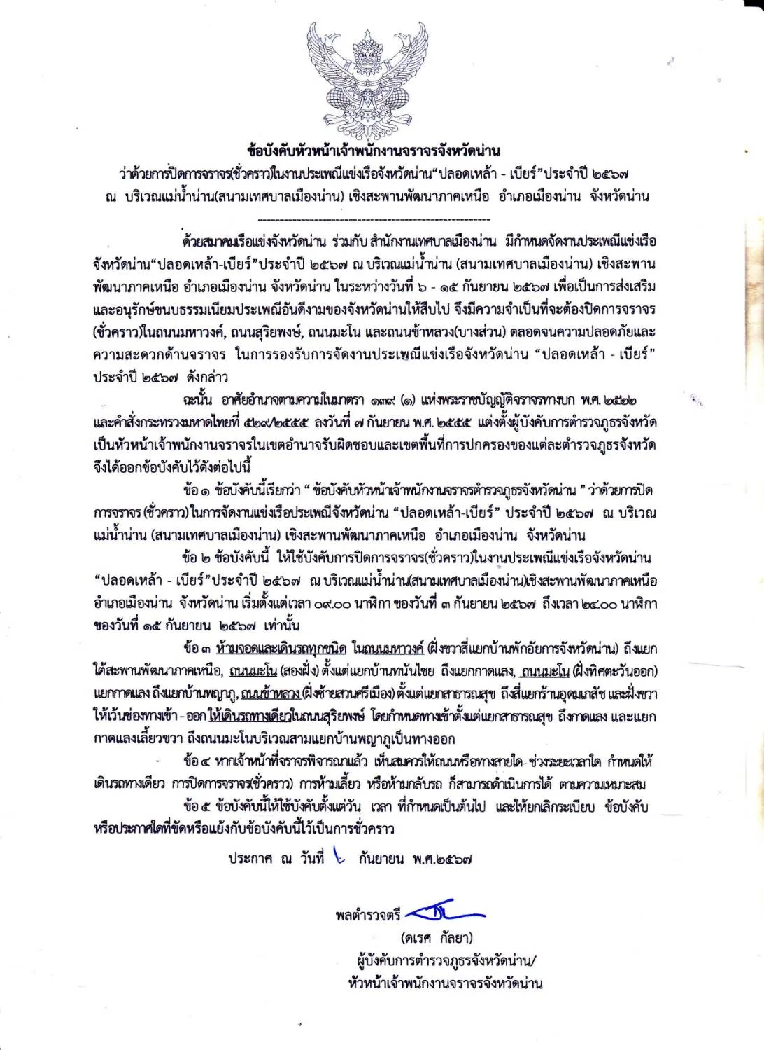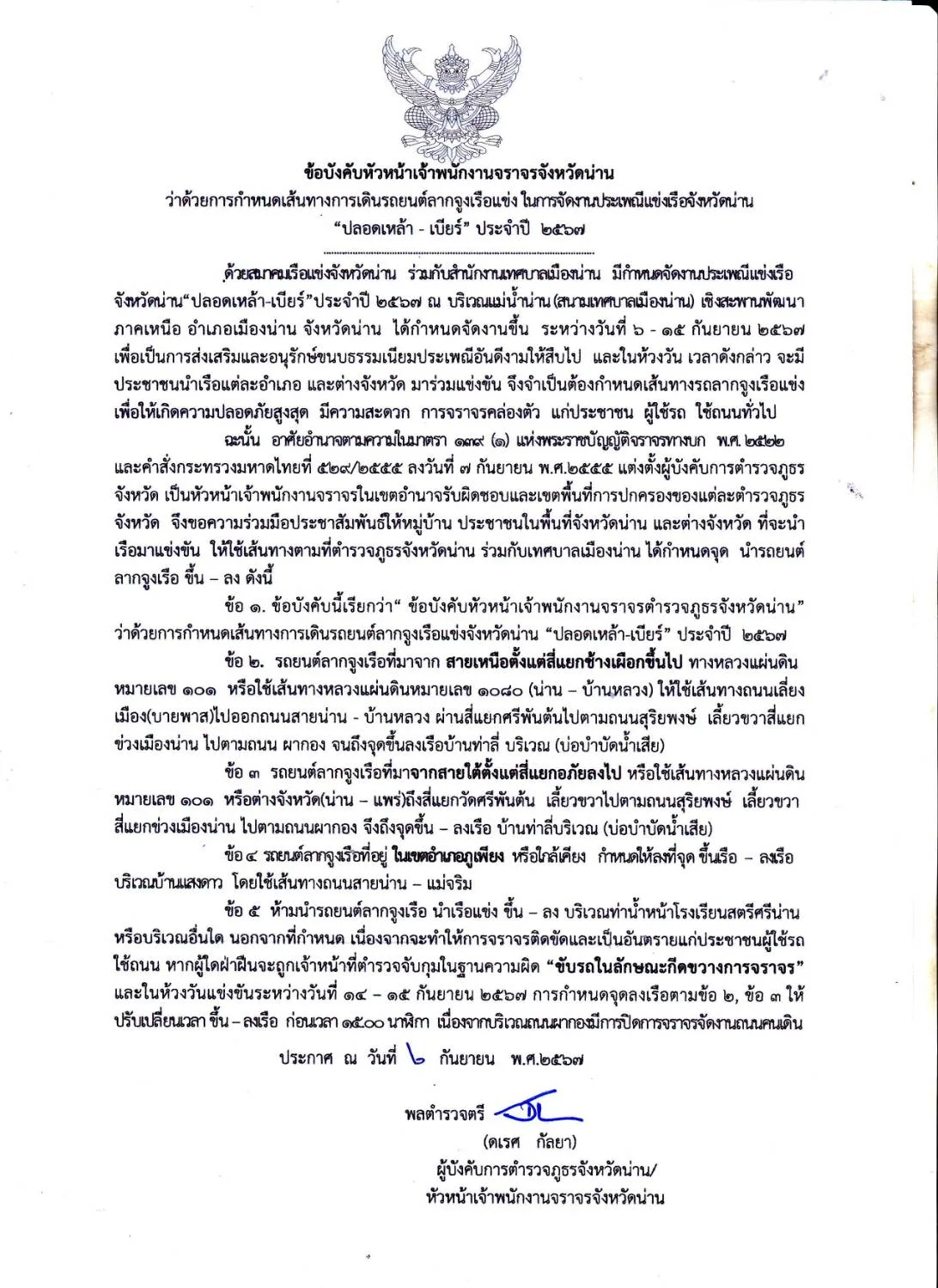 เมื่อวันที่ 3 กันยายน 2567 เวลา 13.30 น. ณ ห้องประชุม 1 สำนักงานเทศบาลเมืองน่าน ได้มีพิธีการจับสลากแบ่งสายเรือแข่งฯ ประจำปี 2567 โดยนายสุรพล เธียรสูตร นายกเทศมนตรีเมืองน่าน กล่าวว่า ทางเทศบาลเมืองน่าน สมาคมเรือแข่งจังหวัดน่าน และตัวแทนเรือแข่งจากหมู่บ้านต่างๆ ร่วมกันจัดงานประเพณีแข่งเรือจังหวัดน่าน (ทานสลากภัตวัดพระธาตุช้างค้ำ วรวิหาร) “ปลอดเหล้า-เบียร์” ประจำปี 2567 ขึ้นระหว่างวันที่ 14-15 กันยายน 2567 ณ บริเวณแม่น้ำน่าน (สนามเทศบาลเมืองน่าน) ใต้สะพานพัฒนาภาคเหนือ ตำบลในเวียง อำเภอเมืองน่าน จังหวัดน่าน