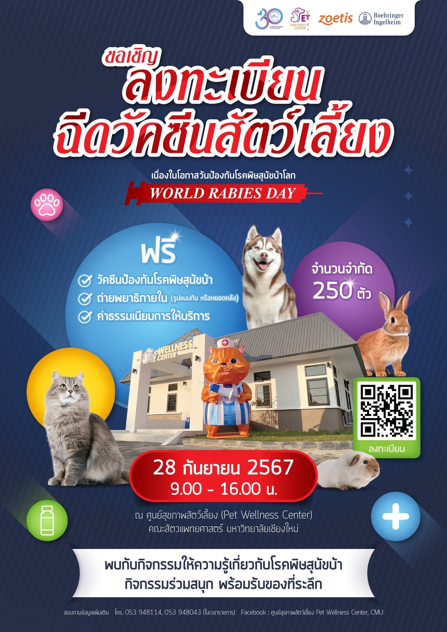 ครอบครัวสัตวแพทย์ มช. ขอเชิญเจ้าของพาสัตว์เลี้ยงแสนรัก ร่วมกิจกรรมเพื่อการดูแลสุขภาพ เนื่องในโอกาสวันป้องกันโรคพิษสุนัขบ้าโลก (World Rabies Day) ณ ศูนย์สุขภาพสัตว์เลี้ยง Pet Wellness Center, CMU ในวันเสาร์ที่ 28 กันยายน 2567 ตั้งแต่เวลา 09.00 – 16.00 น.