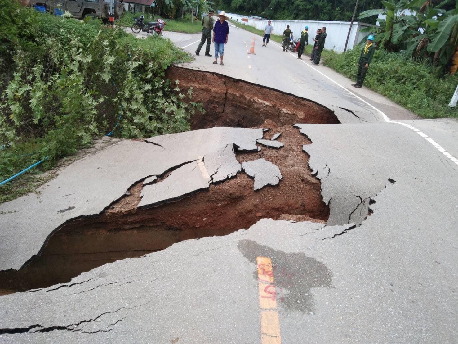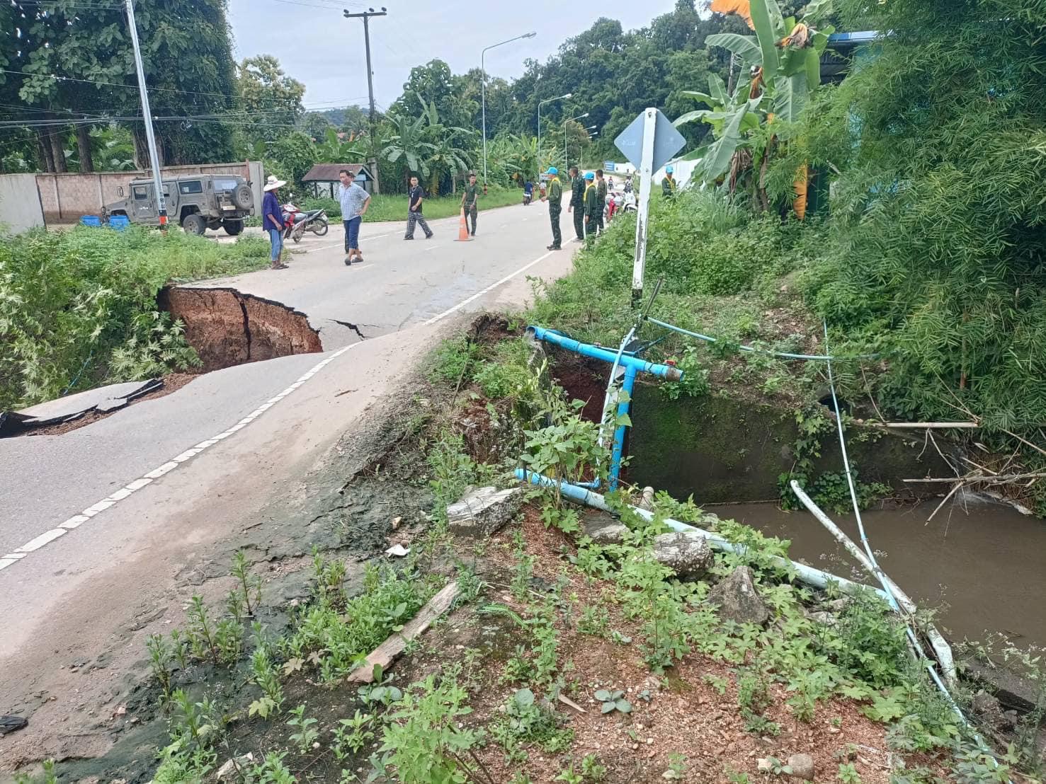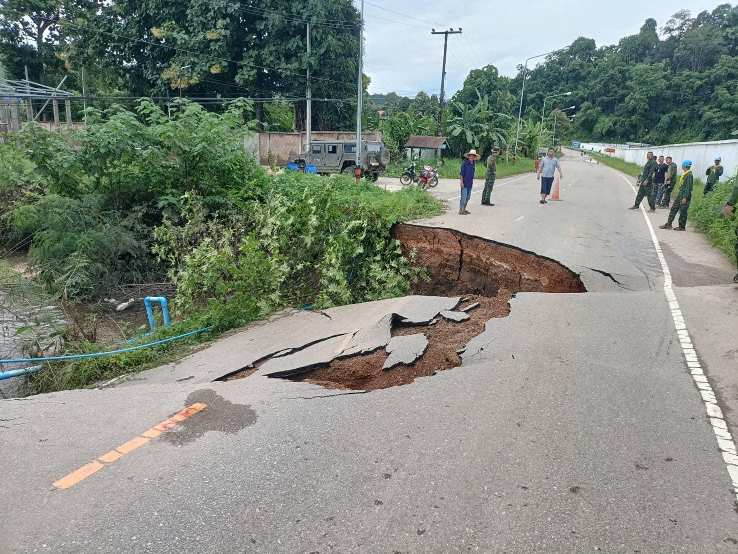 ถนนบิดเบี้ยว จากฝนตกหนักน้ำกัดเซาะถนน บ้านช่องแคบ อ.พบพระ จ.ตาก เกิดทรุด ถนนขาด ประกาศ ห้ามผ่าน