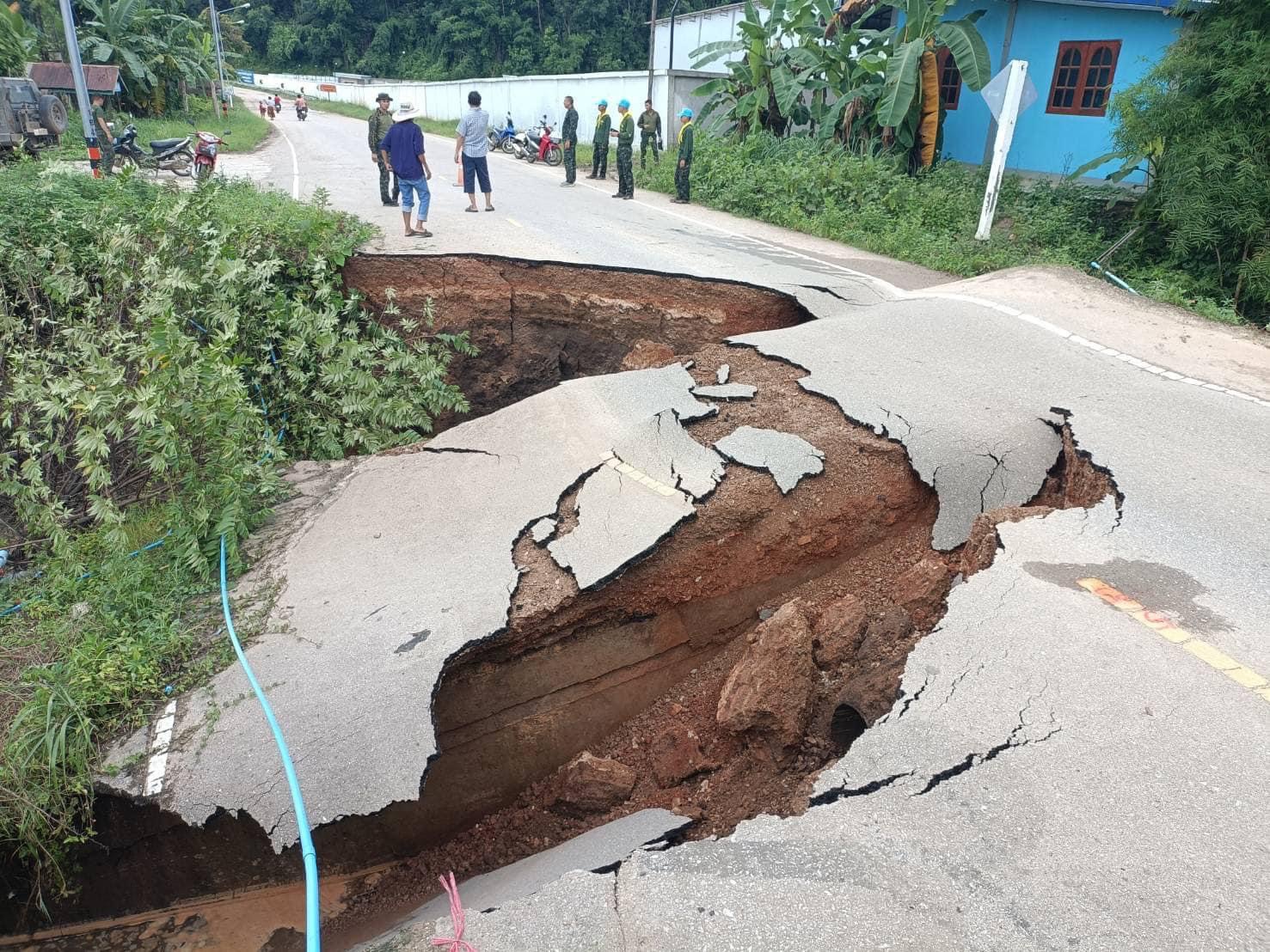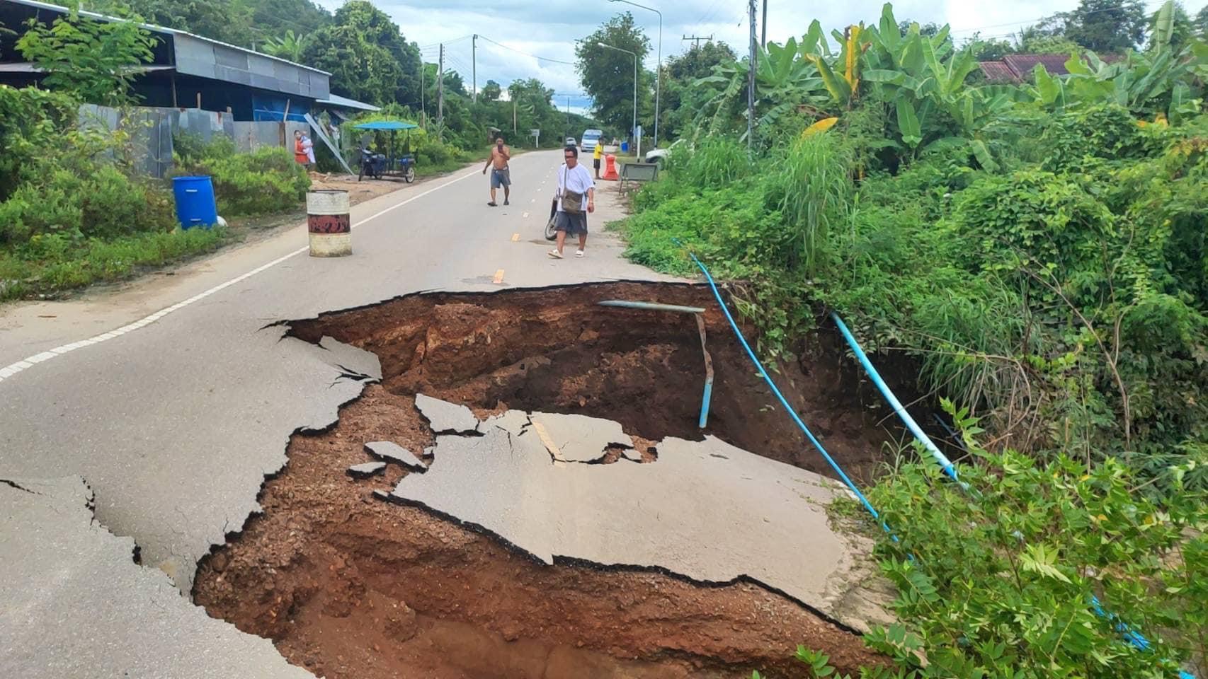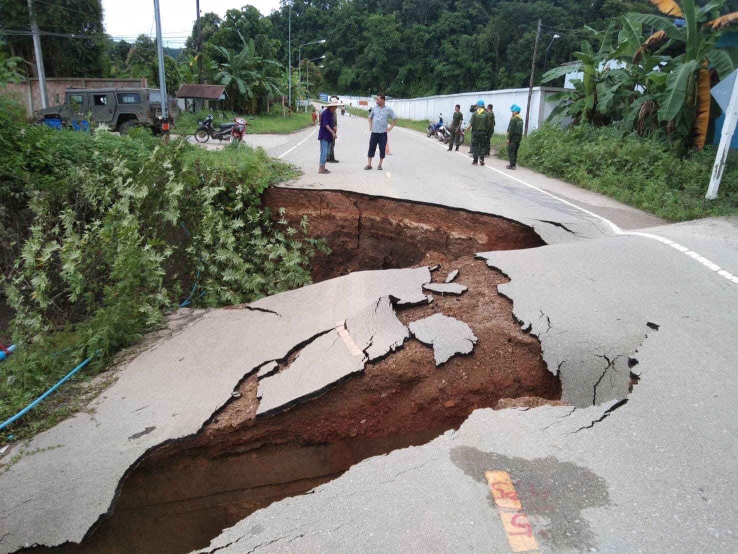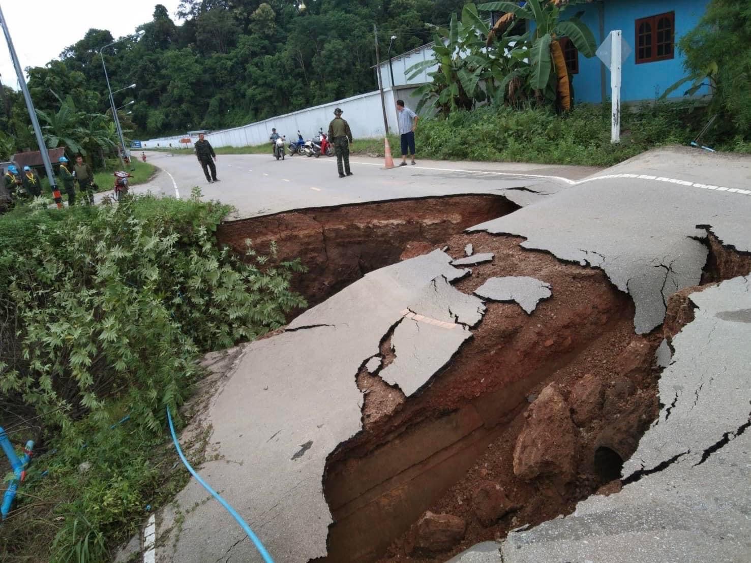 ถนนบิดเบี้ยว จากฝนตกหนักน้ำกัดเซาะถนน บ้านช่องแคบ อ.พบพระ จ.ตาก เกิดทรุด ถนนขาด ประกาศ ห้ามผ่าน