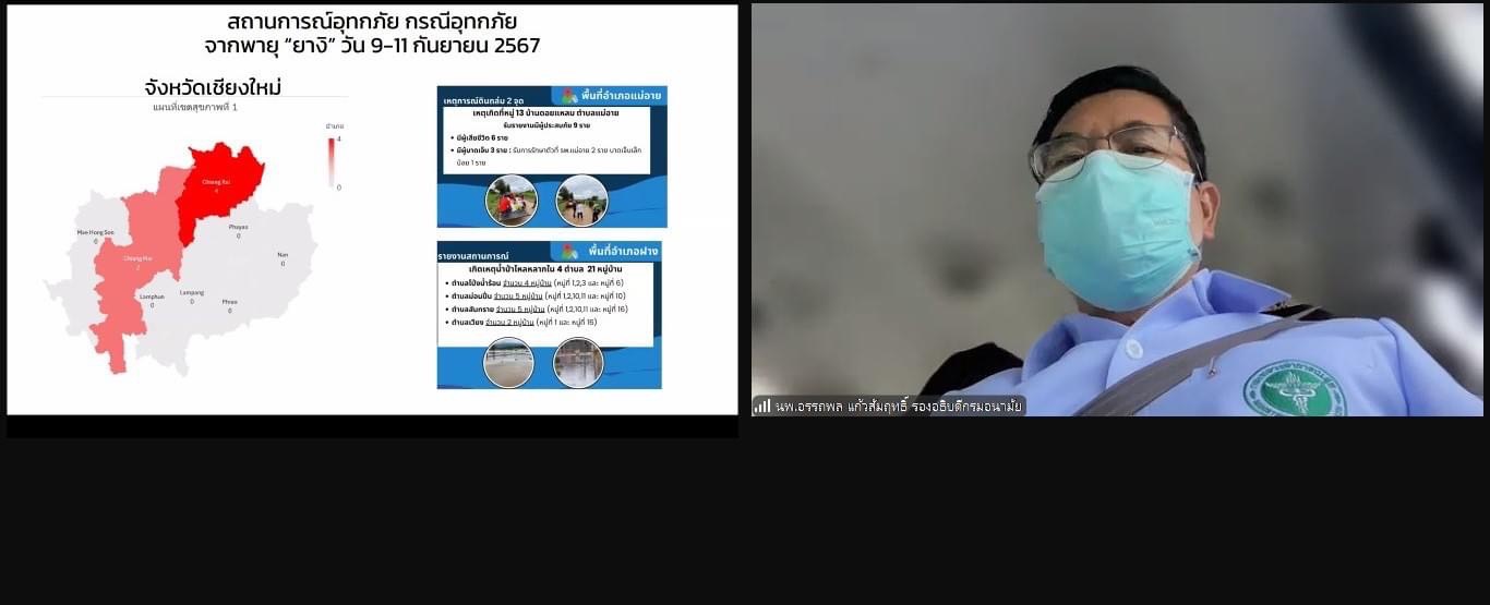 “ทั้งนี้ น้ำท่วมในภาคเหนือที่เกิดขึ้นมักเป็นดินโคลนถล่ม น้ำป่าไหลหลากมา แล้วเคลื่อนตัวไปยังพื้นที่จังหวัดที่อยู่ด้านล่างอย่างรวดเร็ว จึงให้ทีม SEhRT เตรียมสนับสนุนหน่วยงานในพื้นที่ทำการฟื้นฟูหลังน้ำลดโดยสำรวจ ตรวจสอบความเสียหายของระบบสาธารณูปโภคที่สำคัญ เช่น ประปาหมู่บ้าน ประปาชุมชนตลอดจนกิจการที่มีประชาชน ใช้บริการจำนวนมากทั้งตลาด ร้านจำหน่ายอาหาร โรงเรียน ศูนย์เด็กเล็กเพื่อเร่งปรับปรุงระบบให้กลับคืนสู่สภาวะปกติ สะอาด ปลอดโรค ปลอดภัยให้เร็วที่สุด และขอความร่วมมือทุกหน่วยงานเฝ้าระวัง ติดตามสถานการณ์อย่างใกล้ชิดเนื่องจากการเกิดภัยพิบัติมัก มาอย่างรวดเร็ว ไม่ทันตั้งตัว การรับฟังข่าวสาร หมั่นสังเกตความผิดปกติรอบตัว จะทำให้ประชาชนรู้ตัวเร็ว และสามารถหลบหนี อพยพออกจากพื้นที่เสี่ยงได้อย่างรวดเร็ว ลดความสูญเสียที่เกิดขึ้นได้ อีกทั้งขอให้เน้นย้ำการสื่อสารสร้างความรอบรู้แก่ประชาชนผ่านสื่อช่องทางต่าง ๆ อย่างต่อเนื่อง โดยเฉพาะการป้องกันโรคที่มากับน้ำท่วม เช่น โรคน้ำกัดเท้า โรคเชื้อราบนผิวหนัง โรคฉี่หนู ตลอดจนโรคที่เกิดจากการปนเปื้อนของเชื้อโรคลงในอาหาร ทำให้อาหารเกิดการบูดเน่า เมื่อรับประทานอาหารเข้าไป จึงทำให้เกิดภาวะโรคท้องเสียท้องร่วงต่อไป” รองอธิบดีกรมอนามัย กล่าว