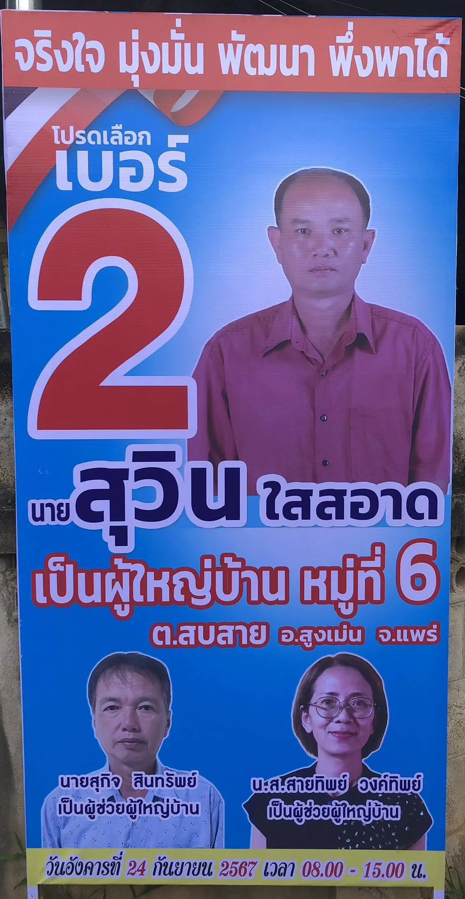ผู้สื่อข่าวรายงานว่าตามที่นางวัชรี ผาทอง ผู้ใหญ่บ้านหมู่ 6ต.สบสาย อ.สูงเม่น จ.แพร่ได้ครบวาระลงทำให้ตำแหน่งผู้ใหญ่บ้าน หมู่ 6 จึงทำให้ตำแหน่งว่างลง