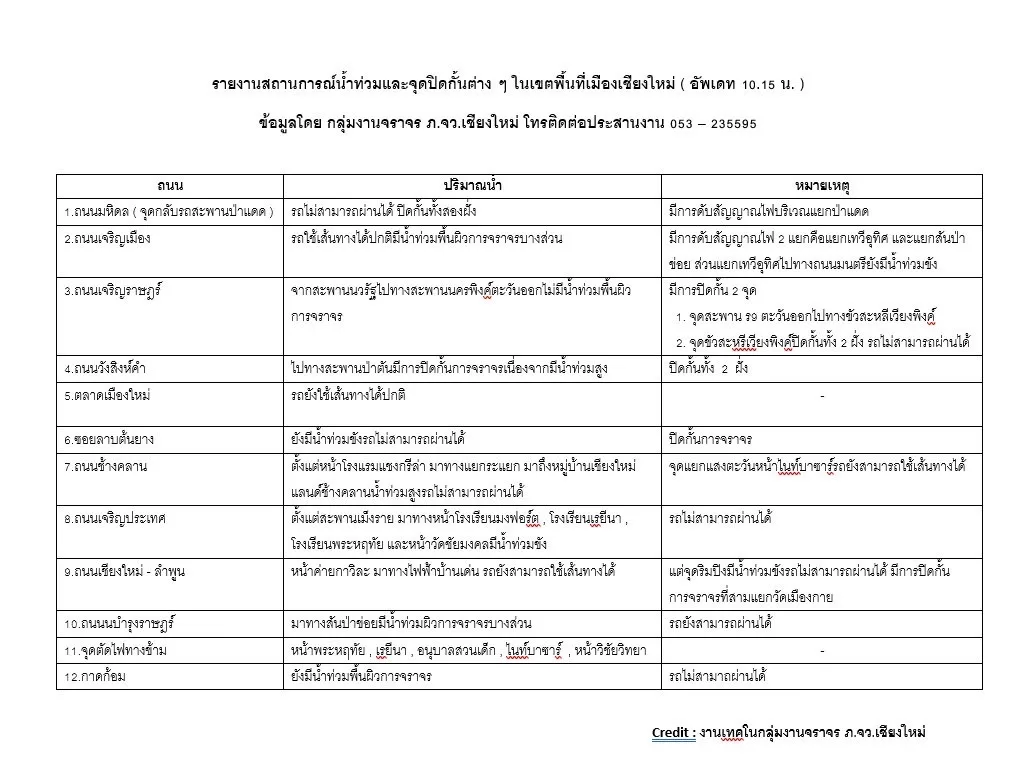 จร.เชียงใหม่ สรุปจุดน้ำท่วมและปิดกั้นเส้นทางสัญจร ในตัวเมืองเชียงใหม่ จำนวน 12 จุด