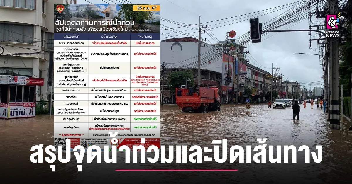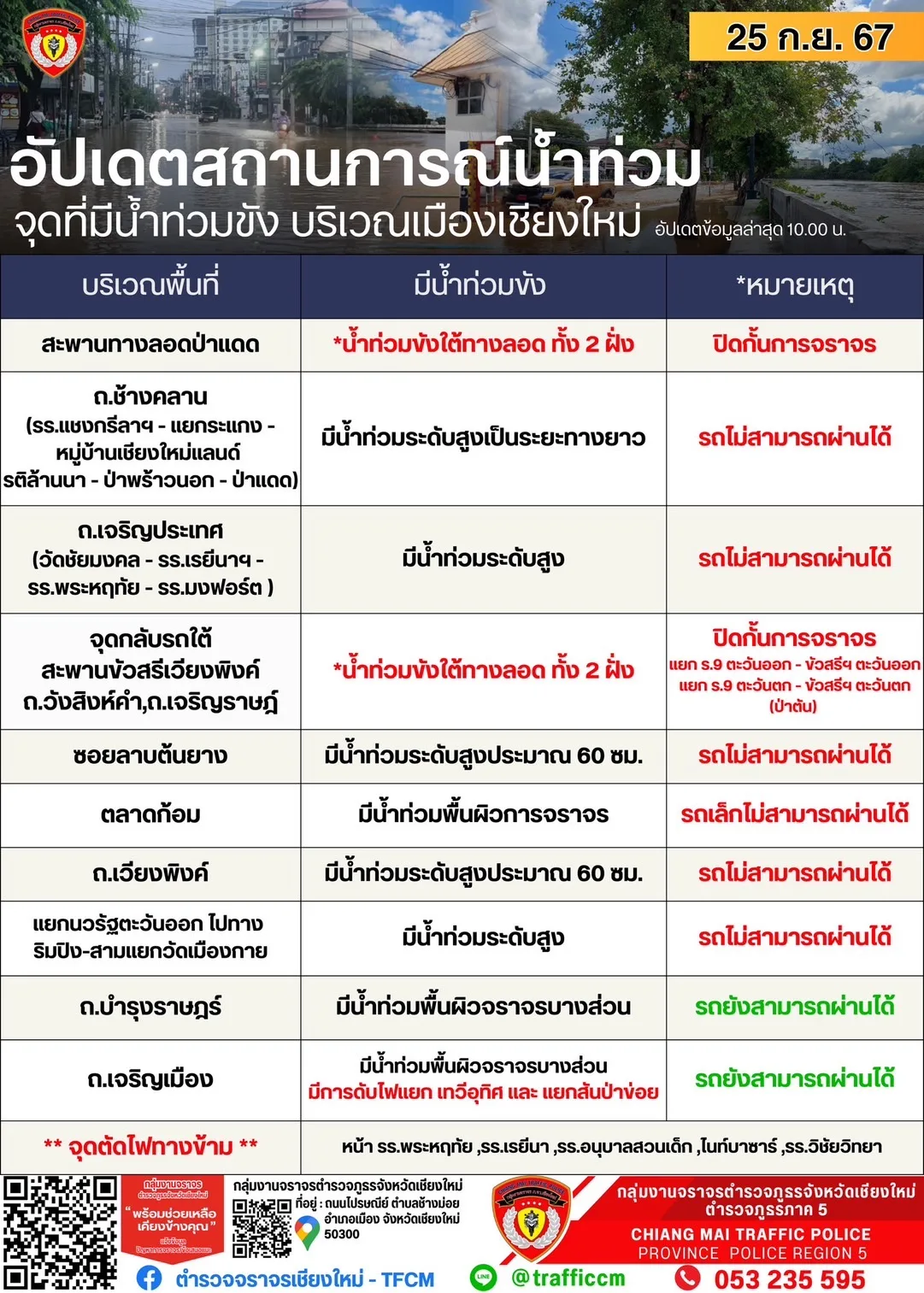 วันที่ 25 กันยายน 2567 ทางกลุ่มงานจราจรตำรวจภูธรจังหวัดเชียงใหม่ ได้สรุปเส้นทางถูกน้ำท่วมขัง ปิดการสัญจรชั่วคราว ในเขตตัวเมืองเชียงใหม่จำนวน 12 จุด โดย