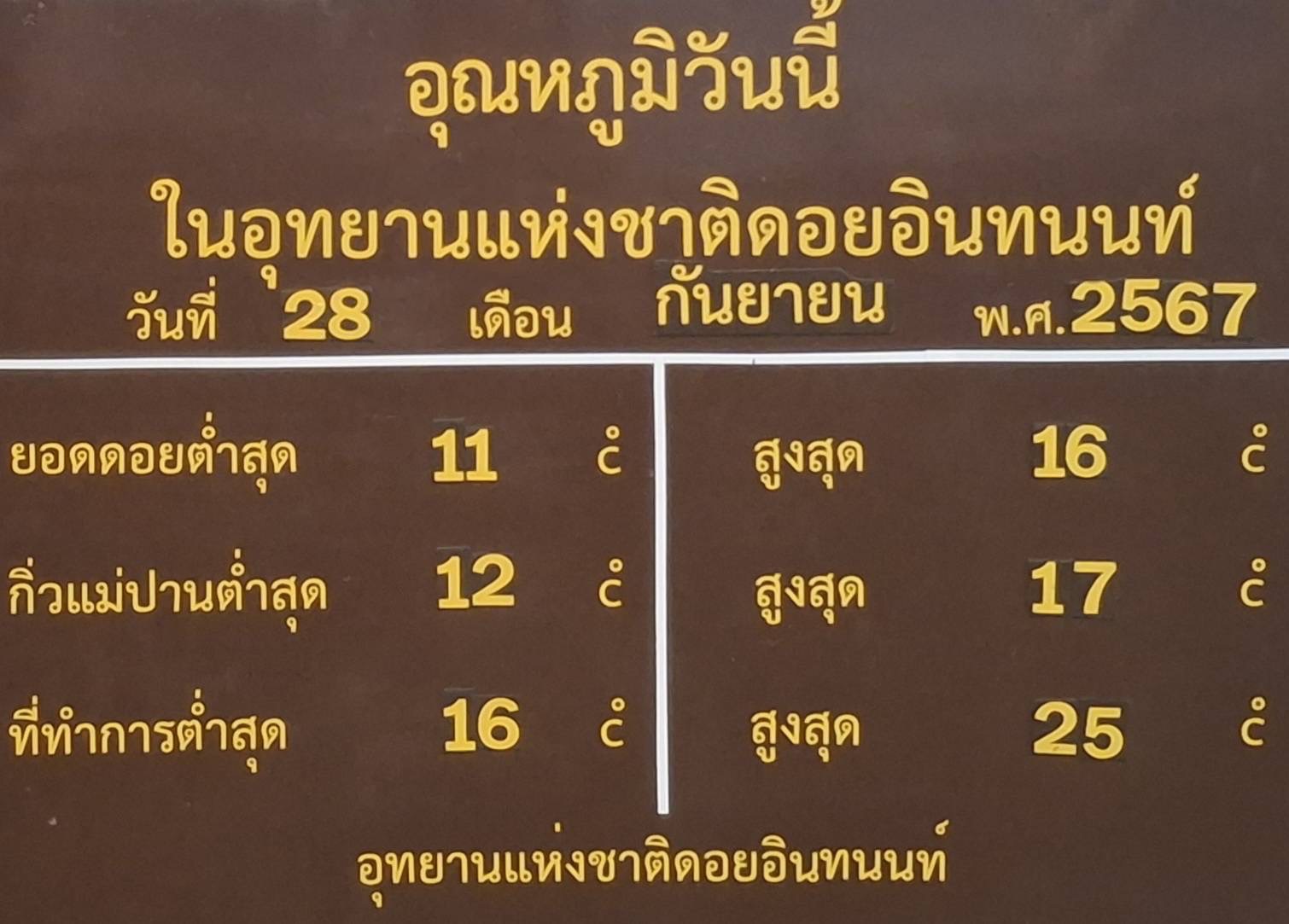 อุณหภูมิเช้านี้ต่ำสุดวัดได้ที่ยอดดอยอินทนนท์ 11 องศาเซลเซียส จุดชแสงแรกเช็คอินยามเช้าตรู่กิ่วแม่ปานวัดได้ 12 องศาเซลเซียส กำลังหนาวเย็นสบายๆ ส่วนที่ทำการอุทยานแห่งชาติดอยอินทนนท์ กม.31 วัดได้ 16 องศาเซลเซียส มีฝนตกที่ด่าน 5 ขุนวาง 10 มิลลิเมตร และยอดดอย 9 มิลลิเมตร