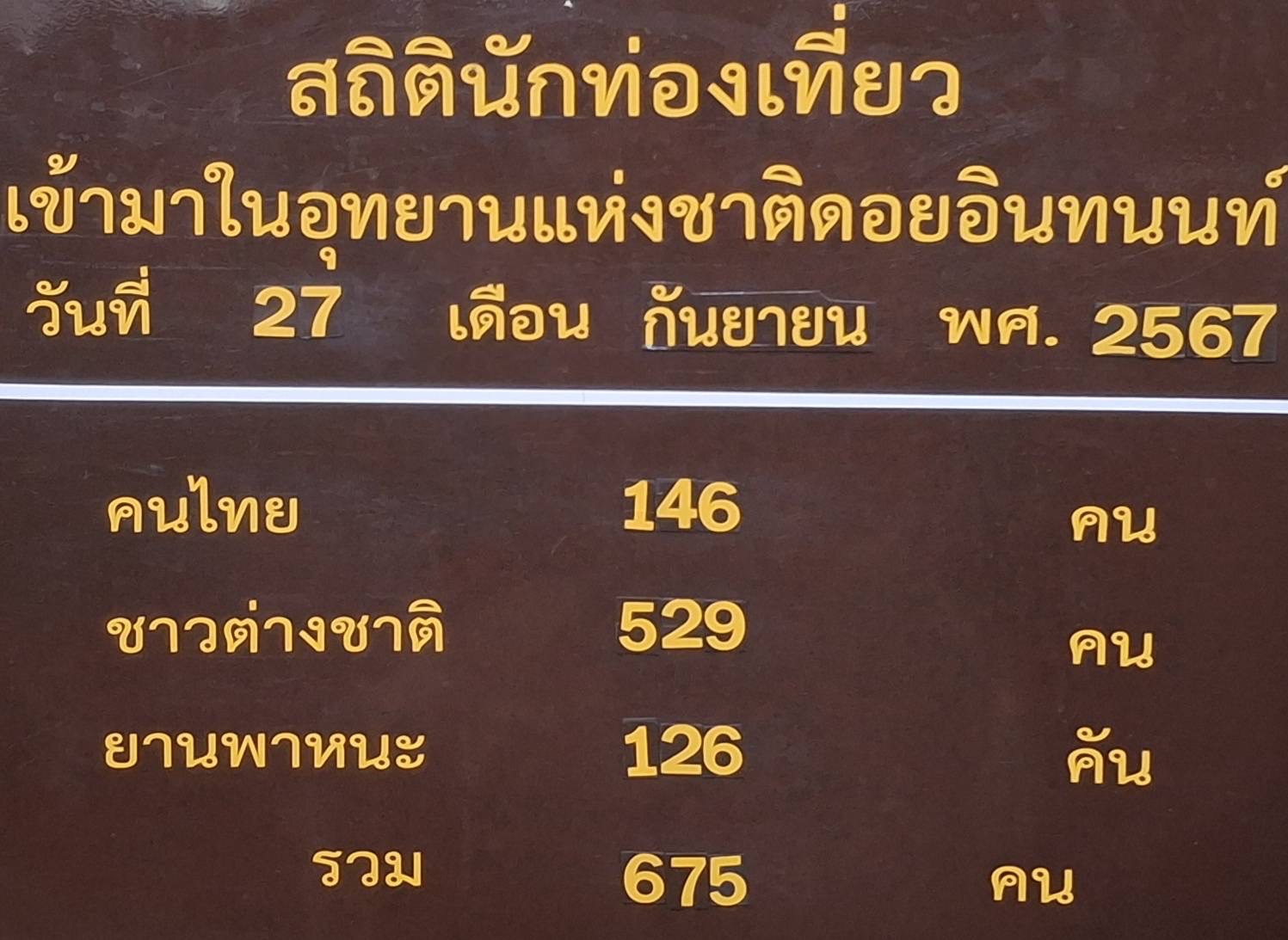 สถิตินักท่องเที่ยวสะสมจากเมื่อวานนี้ นักท่องเที่ยวชาวไทยจำนวน 146 คน นักท่องเที่ยวต่างชาติจำนวน 529 คน ยอดรวมจำนวน 675 คน ยานพาหนะ 126 คัน การขับขี่รถขึ้นลงดอยอินทนนท์ ต้อเพิ่มความระมัดระวังเป็นพิเศษ โดยเฉพาะขาลงจากดอยต้องใช้เกียรต่ำ สังเกตุเบรคกลิ่นเพื่อลดการเกิดอุบัติเหตุในการเดินทาง่องเที่ยวได้อย่างปลอดภัย การขับขี่รถบนดอยยังคงต้องระมัดระวังในการขับรถขึ้นดอย และใช้เกียร์ต่ำ